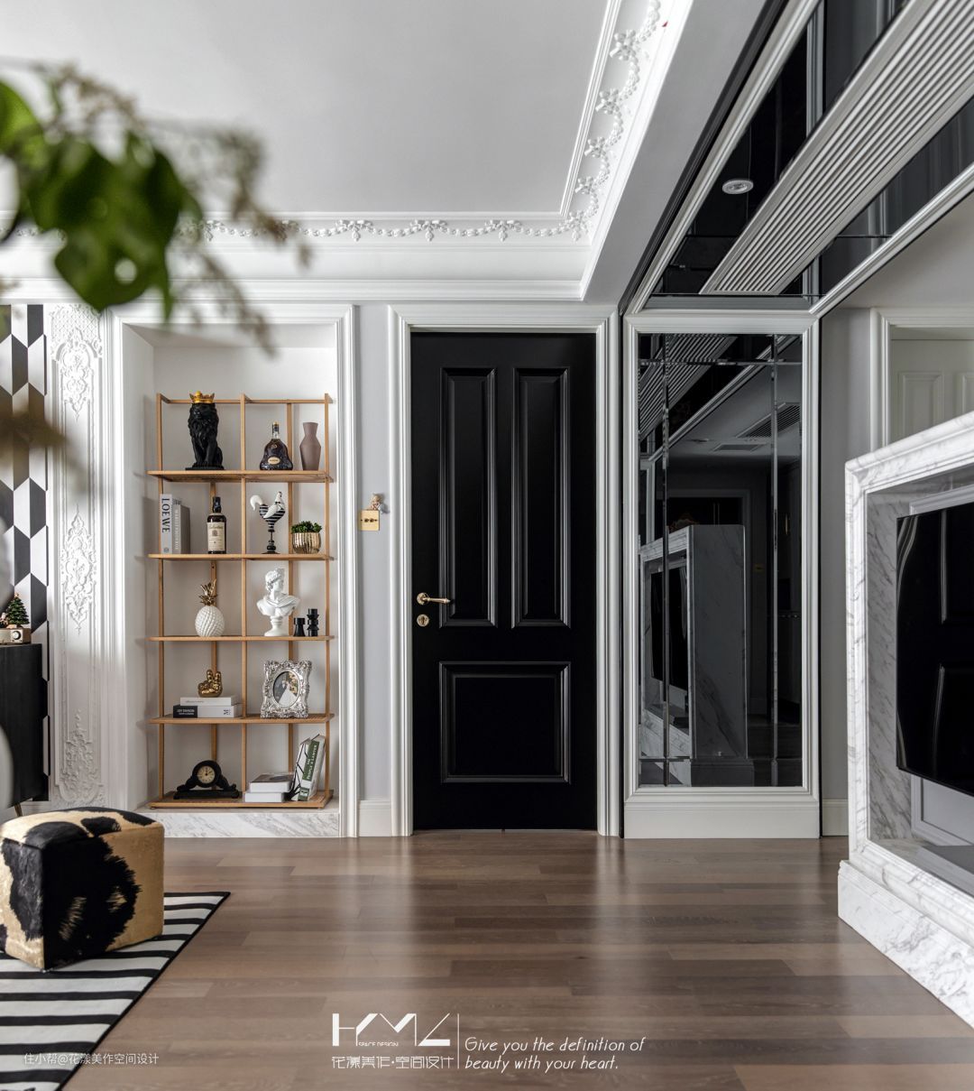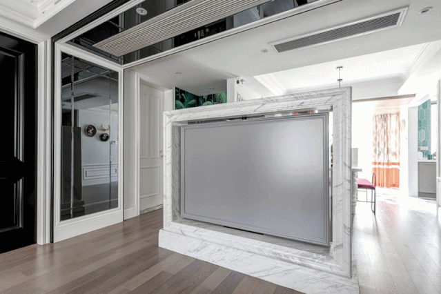 ▼旋转电视架上方正好是客餐厅放置空调的位置,利用宽门套结合车边灰镜效果进行视觉拓展,让原本客厅最低点的过道视野得到扩展,定制长的整段白色出回风口,比例完整贴合。同时,这块采用外黑100mm的大门套框内套60mm长方形白色内框组合,与客厅两个卧室门的色彩搭配反差交融,整体统一又富有古典韵味的细节,使这块交接空间的层次进行了气质上的升华。
