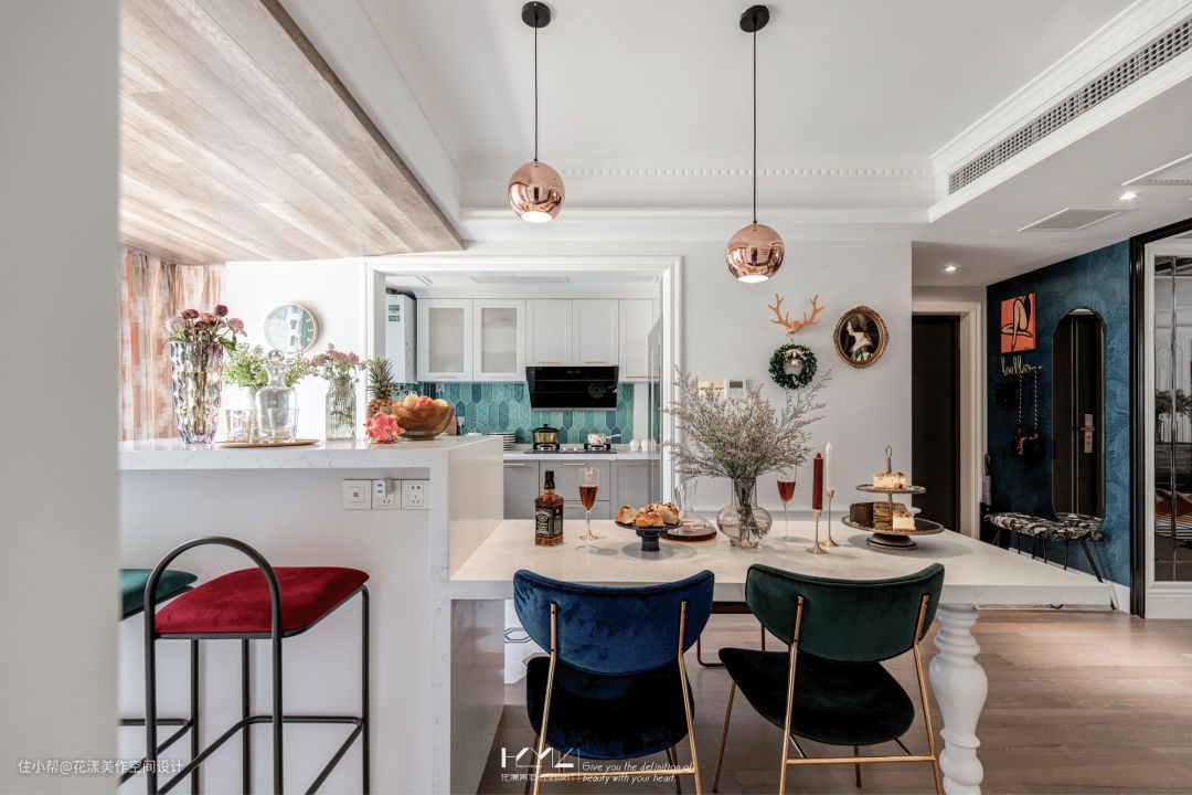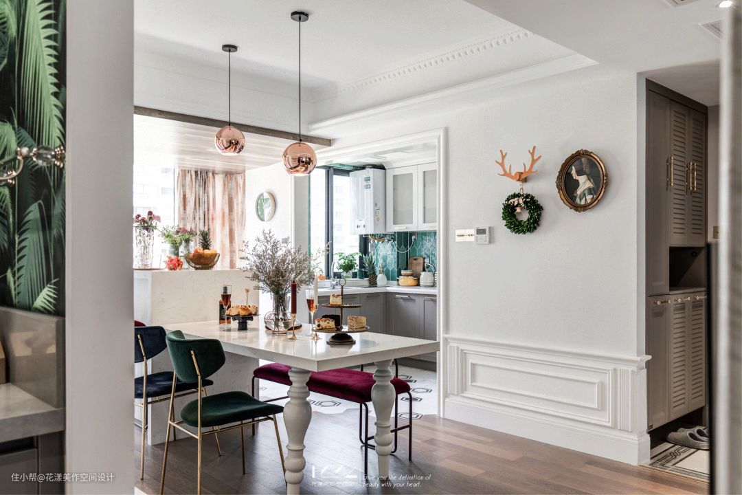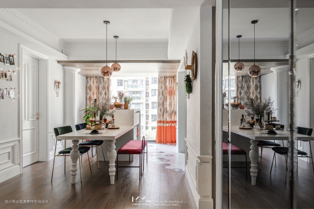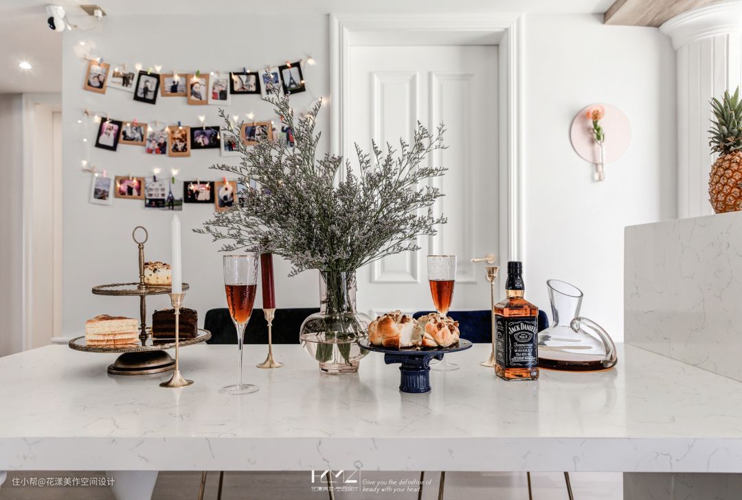 ▼餐桌台面与岛台进行一体化设计,餐桌和桌腿都是找厂家根据图纸定制的,造型憨厚可爱的罗马烤漆实木柱腿,带着一点点复古感,台面选用了白色的带纹理的石英石。