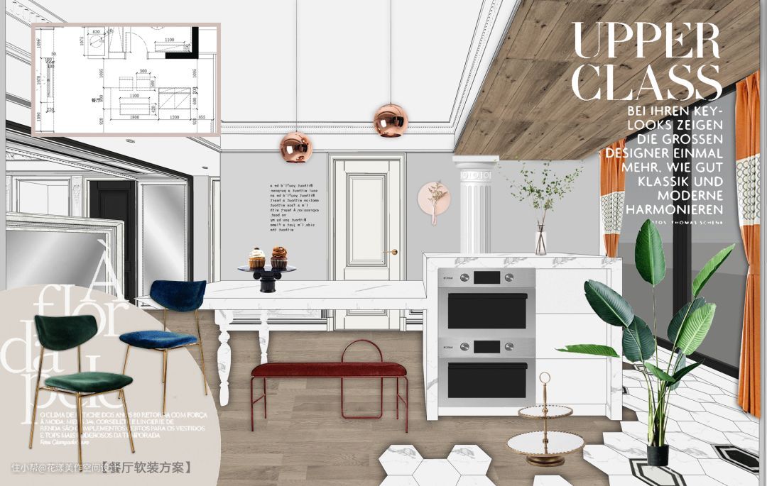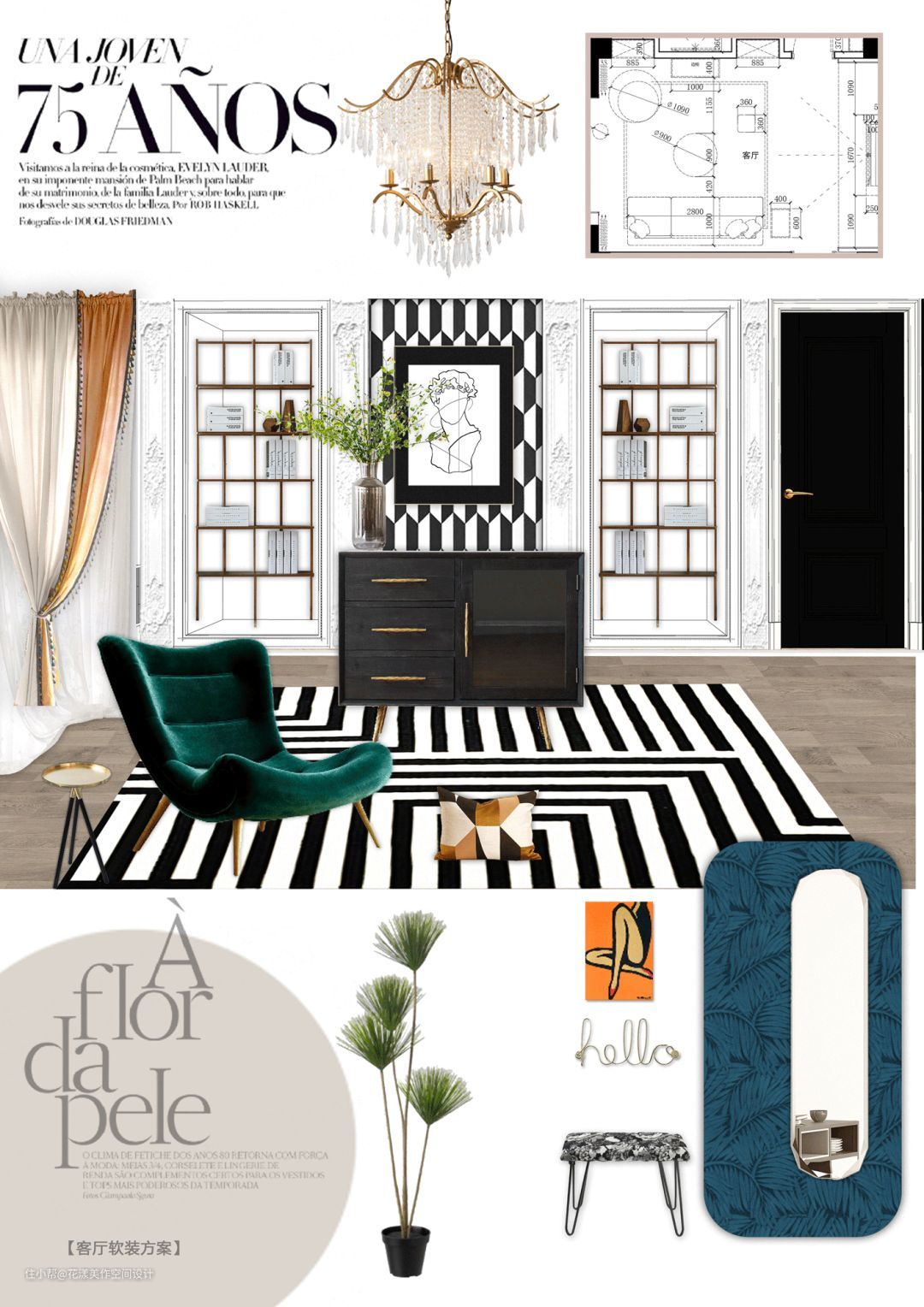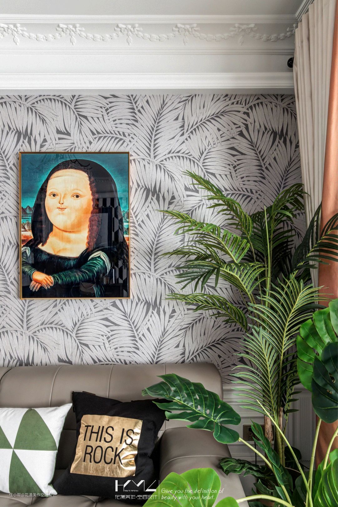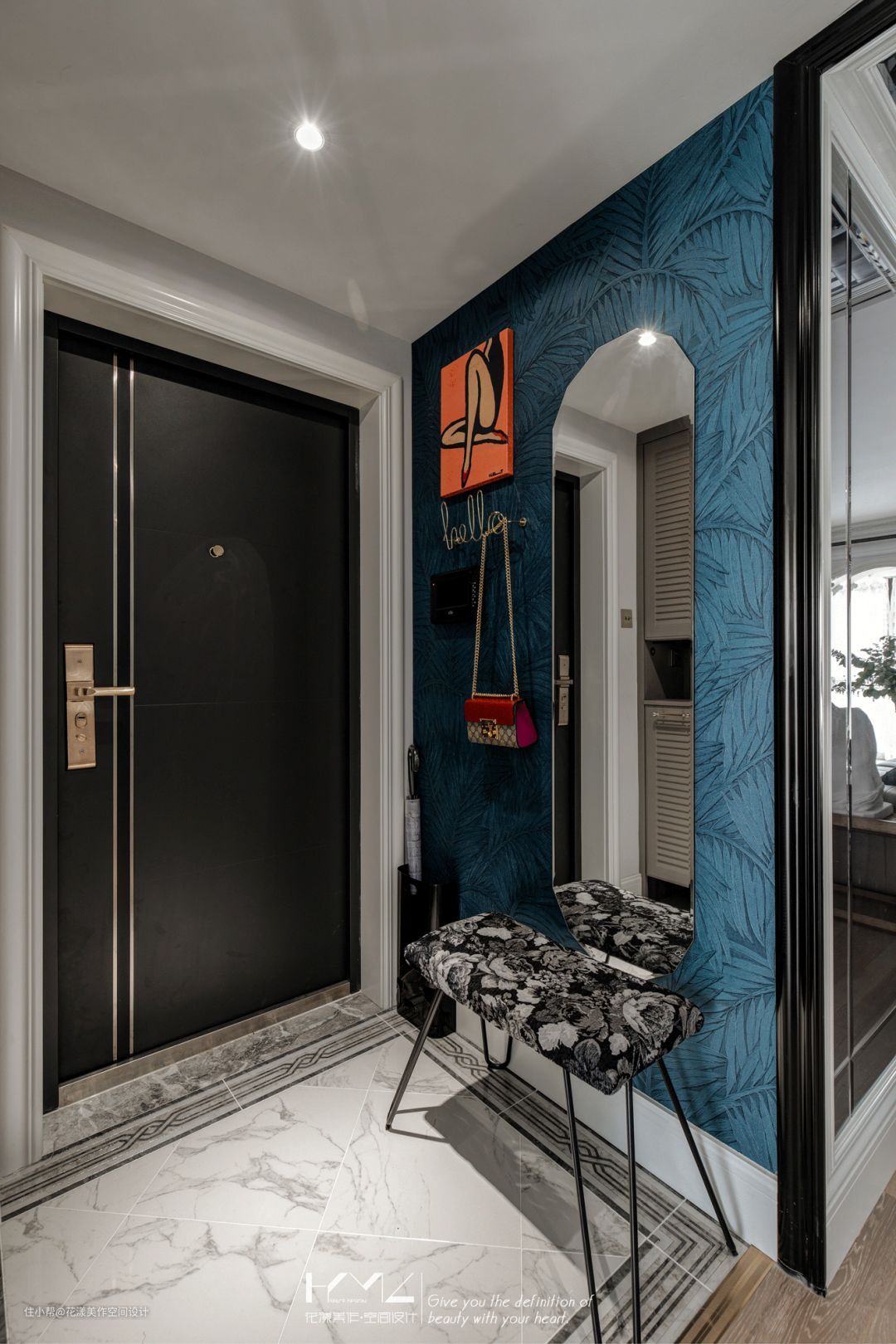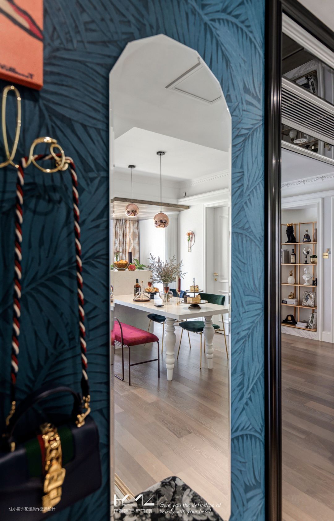▼开门入户,时尚混搭气息扑面而来,左手边是比利时arte进口墙纸,图纹是热带雨林的叶子,深蓝的静谧与凹凸有致的纹理搭配时尚跳色挂画,金色英文字母“hello”挂钩,右边棱角分明的全身镜,地面是经典法式花纹围边,右边扣线门板加百叶门板的组合配上精致复古的把手,野兽派独特花纹的细腿长凳,每一个细节都将精美质感伶俐体现,一个时尚复古的混搭之家,就这样映入眼帘……