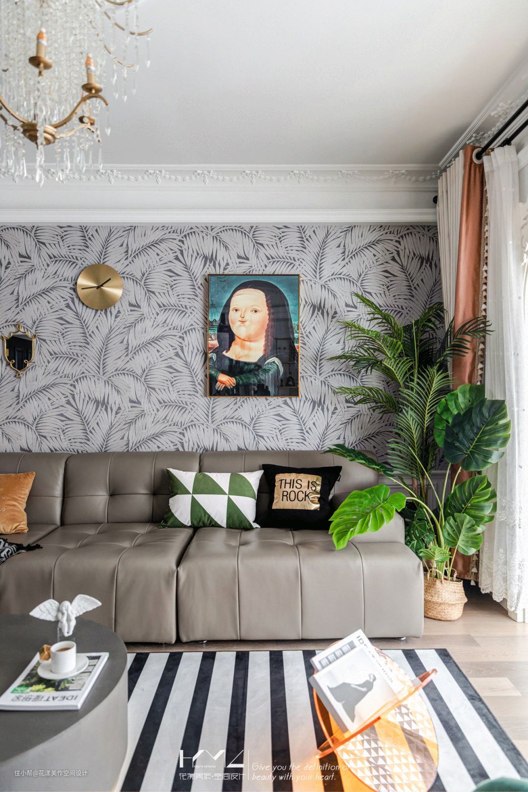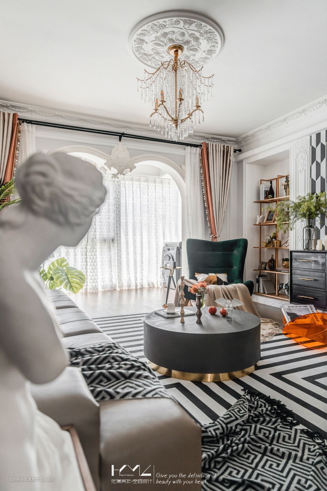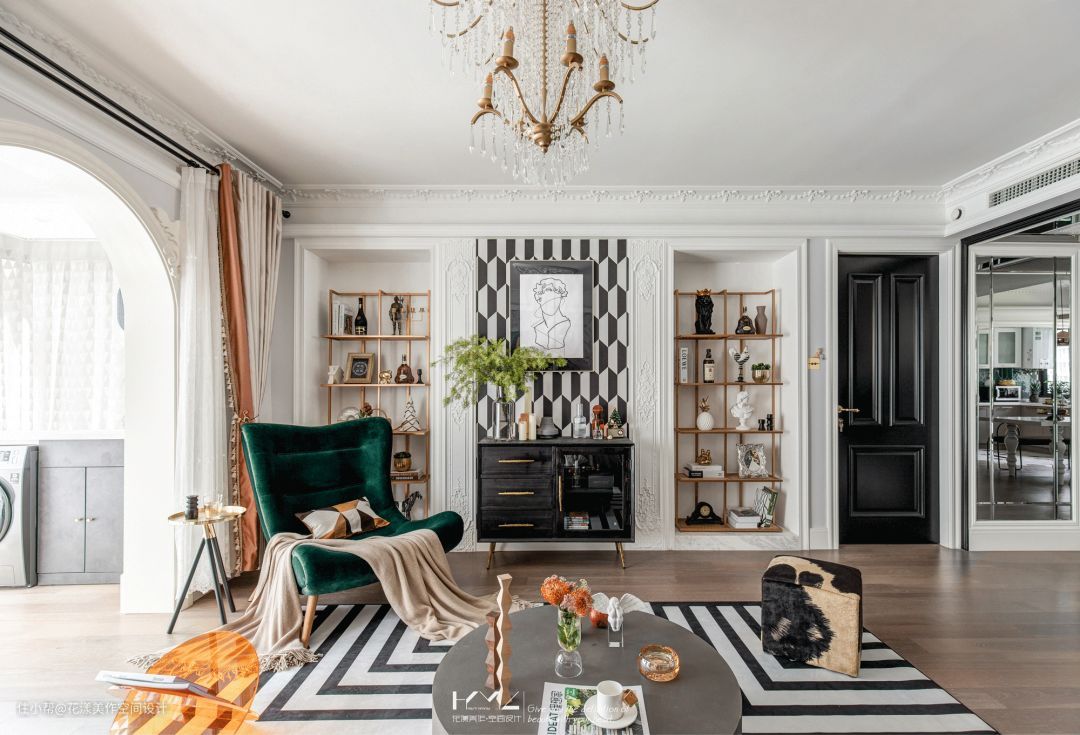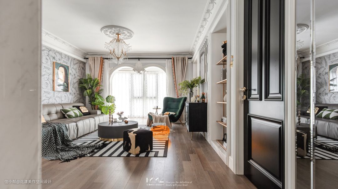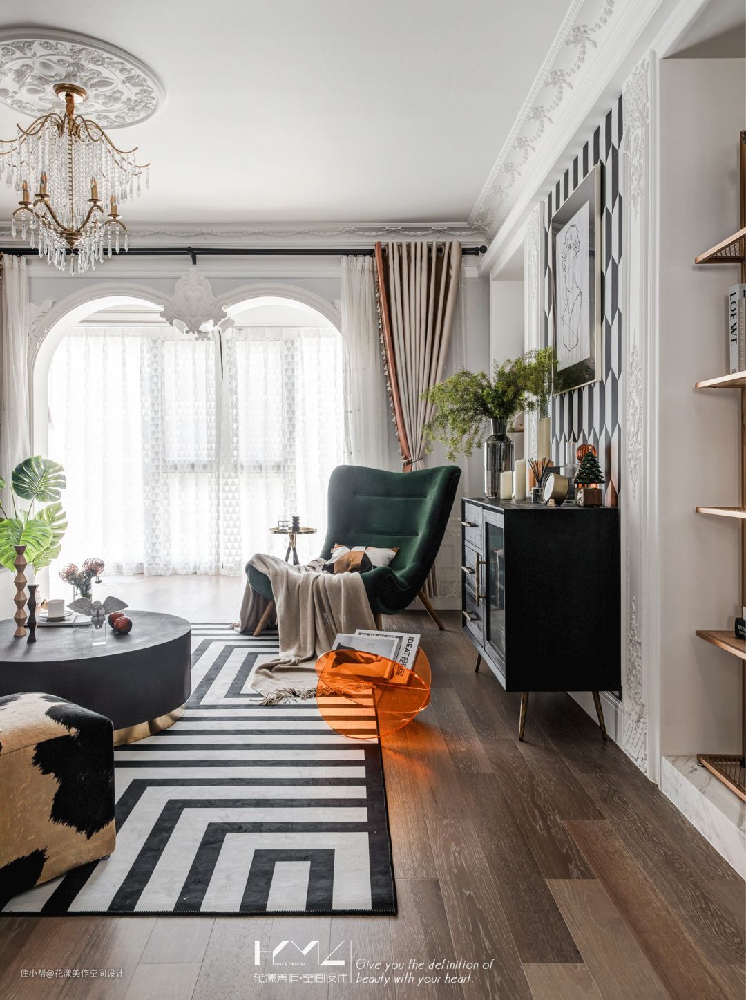 ▼客厅空间的整体氛围相对于餐厅,更显沉稳,色调以灰白黑为主,沙发选用了浅暖灰色皮质沙发,造型现代干练,材质经久耐用,局部软装进行跳色搭配,暖橙与墨绿在抱枕、窗帘、单人绒布沙发、亚克力杂志架以及装饰画上交相辉映,在这现代法式的基调上融入了新鲜活力,造型古典优美的水晶吊灯,仿佛一个典雅的公主,扭动着她那婀娜的身姿,剔透柔美。
