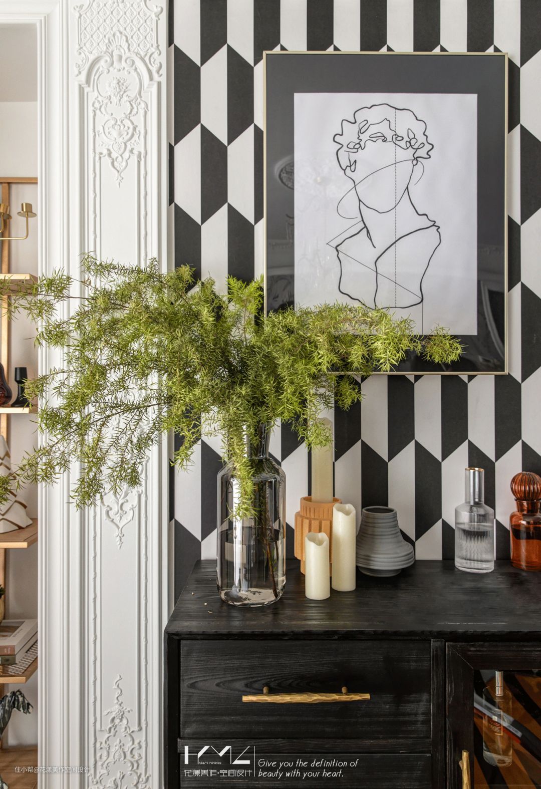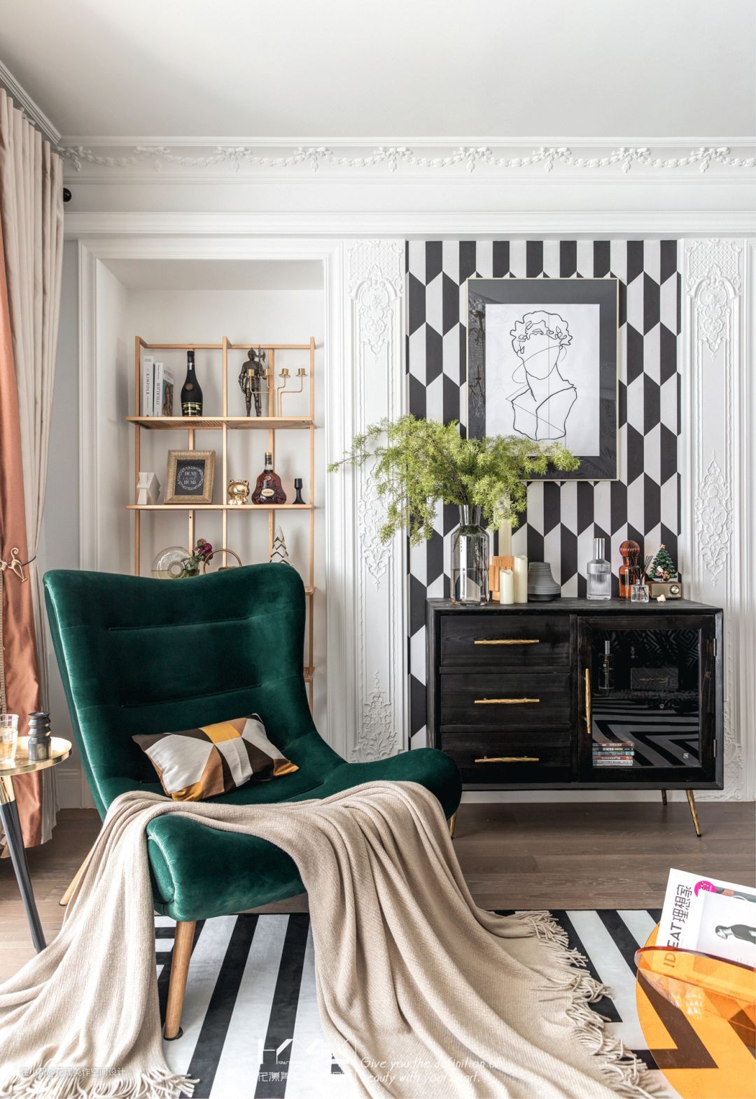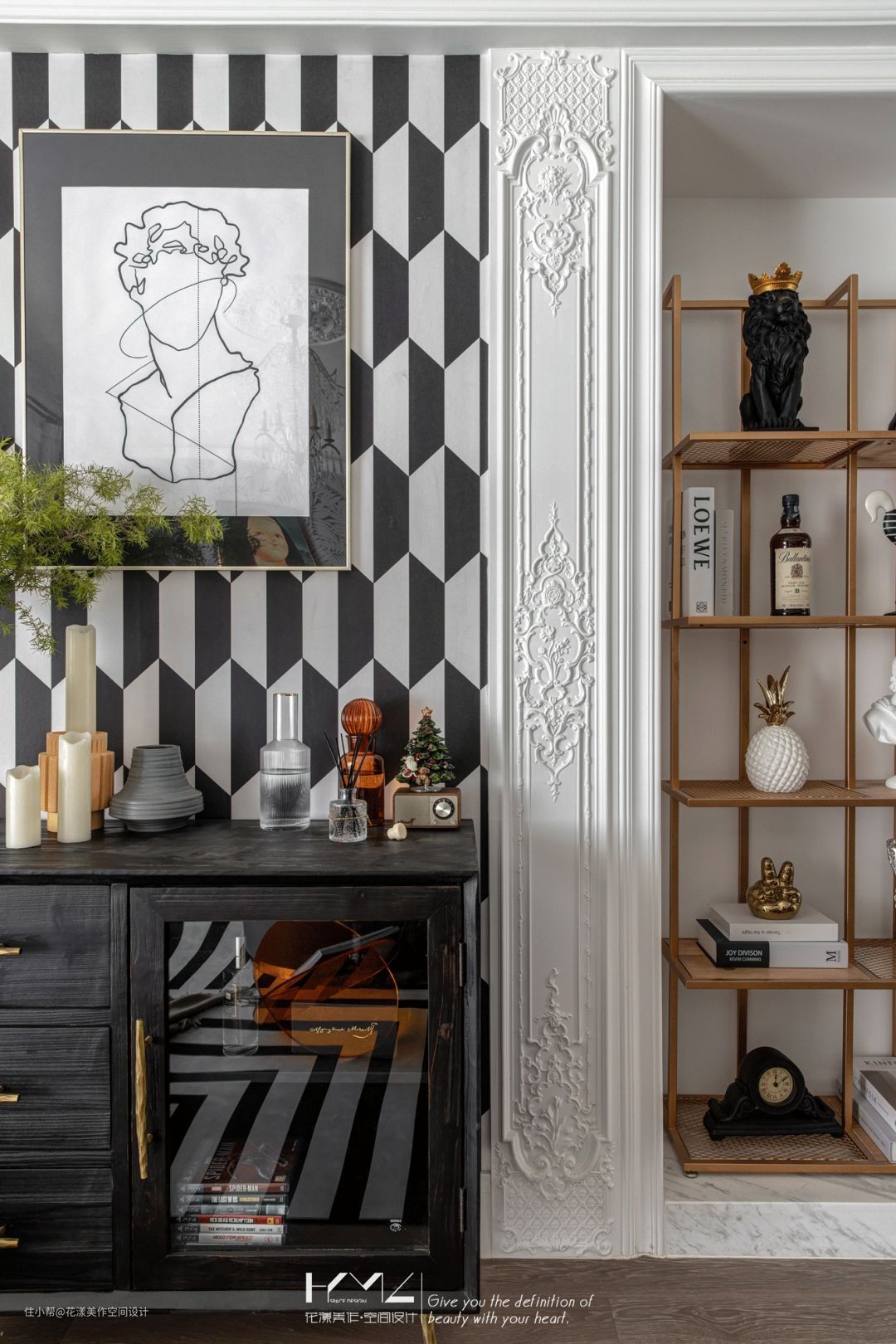 ▼中间是英国Cole&Son 进口墙纸几何图案 型号是:黑白色 105/12050,与黑白条纹的地毯琴瑟和鸣,中间的大卫简笔艺术画,香槟色的画框,提升了这面背景的艺术气息。黑色复古边柜沉稳不张扬,沉淀了客厅的摩登气质。
