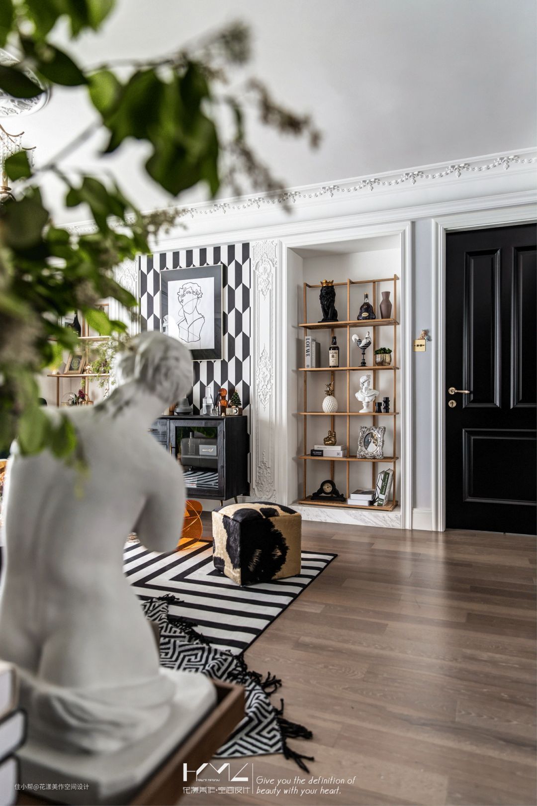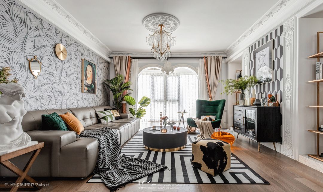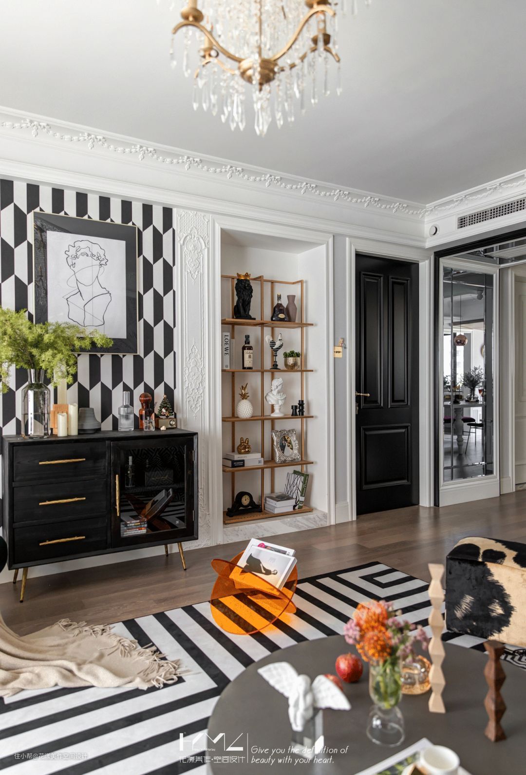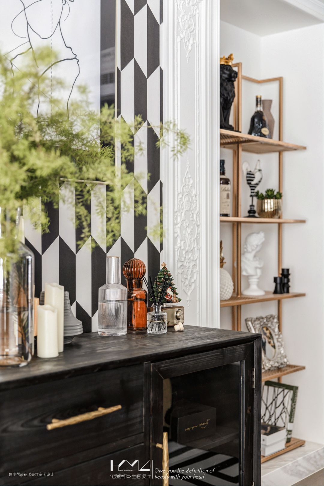 ▼中间是英国Cole&Son 进口墙纸几何图案 型号是:黑白色 105/12050,与黑白条纹的地毯琴瑟和鸣,中间的大卫简笔艺术画,香槟色的画框,提升了这面背景的艺术气息。黑色复古边柜沉稳不张扬,沉淀了客厅的摩登气质。