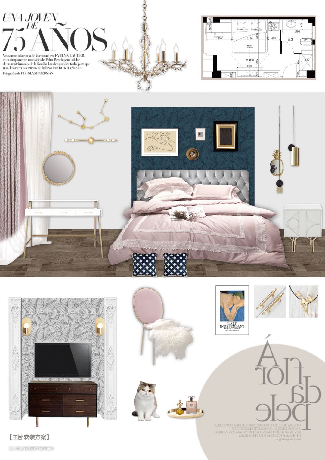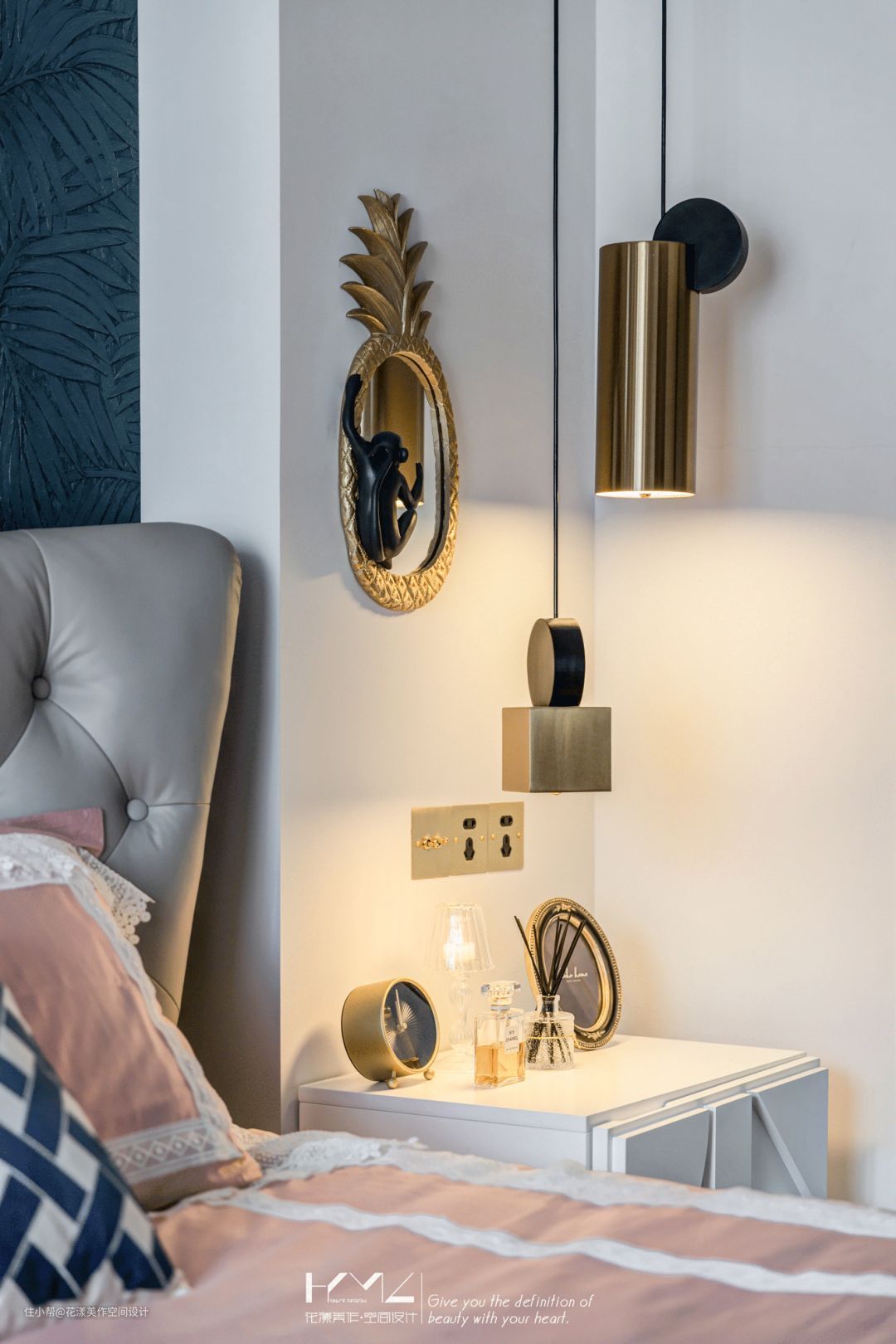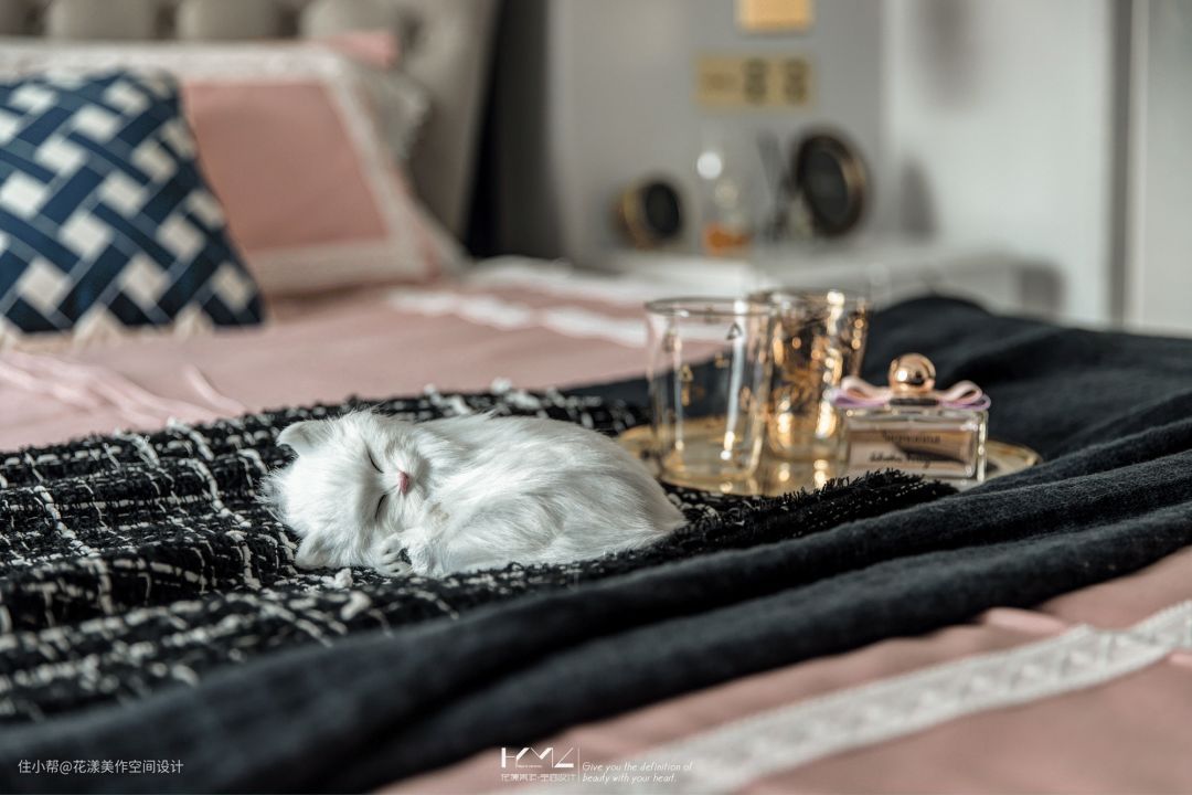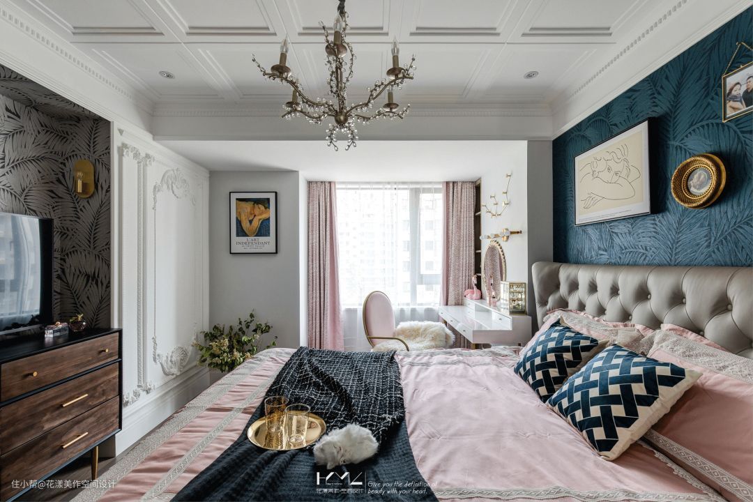 ▼主卧室,初始的设计是明亮色系的,在后期的软装方案中,我们方向发生了转变,也是想更贴合客厅的整体精致氛围,女业主的心里一直有个公主梦,她喜欢粉色和blingbling质感的饰品,所以我们后期混合了粉色系和金属质感的家具,复古水晶吊灯,吊顶的凹凸叠级,则是融入了法式宫殿情怀,让每个细节都精致有度的展现我们业主的喜好。
