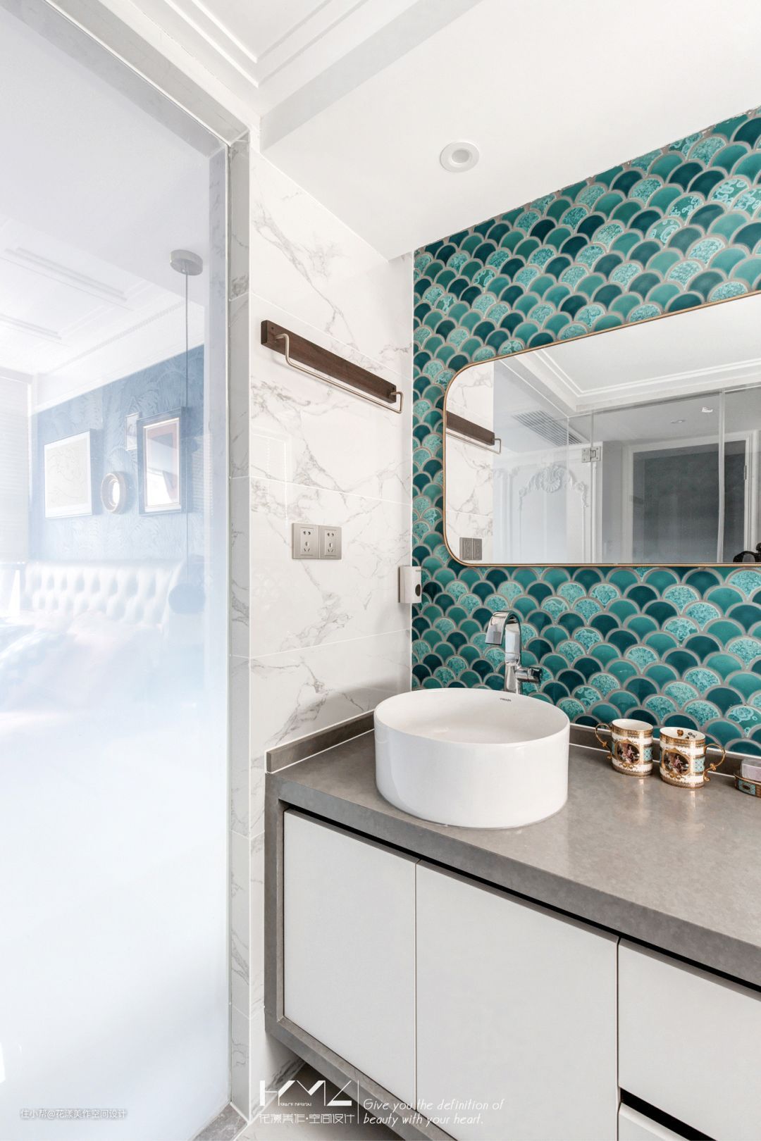 ▼扇形马赛克冰裂纹瓷砖是这个空间的亮点,这边特别选用了灰色的瓷缝,让每个扇型都融合成一个整体,这也与厨房墙砖的搭配有异曲同工之妙,上下灯带补充了空间的精致氛围感,大面黄铜框装饰镜,增加了空间视觉,又很好的满足了女业主的需求。