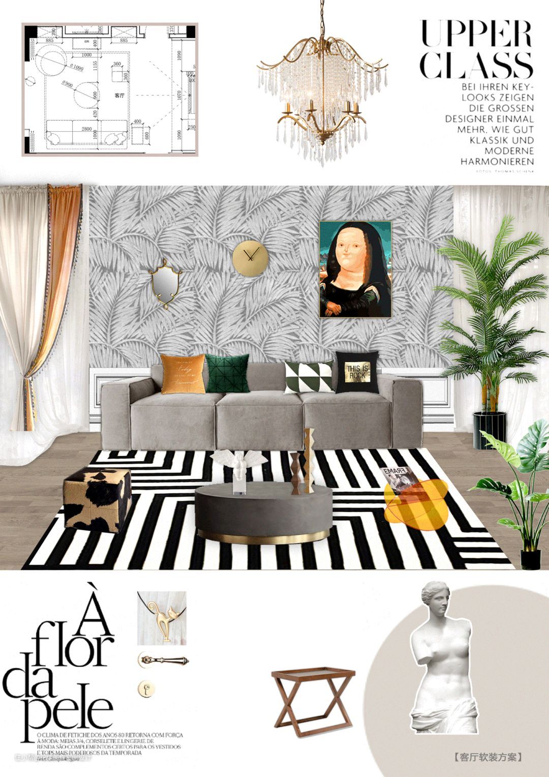沙发背景是比利时ARTE 进口墙纸壁纸, 型号是75207,凹凸有致的纹理,精美而又典雅。古典优雅造型的铜镜+现代极简挂钟,现代与古典的碰撞,彰显了气质的完美统一。