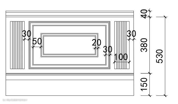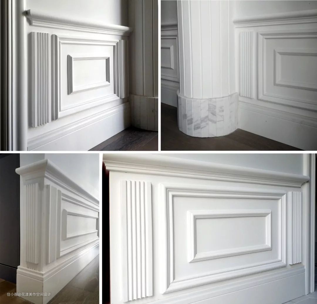 ▼我们利用pu线条做出半护墙感觉,将几道墙按不同宽度比例分割,用腰线+双回字pu线,左右两边用100mm宽竖槽pu墙板收边,比例完美契合。