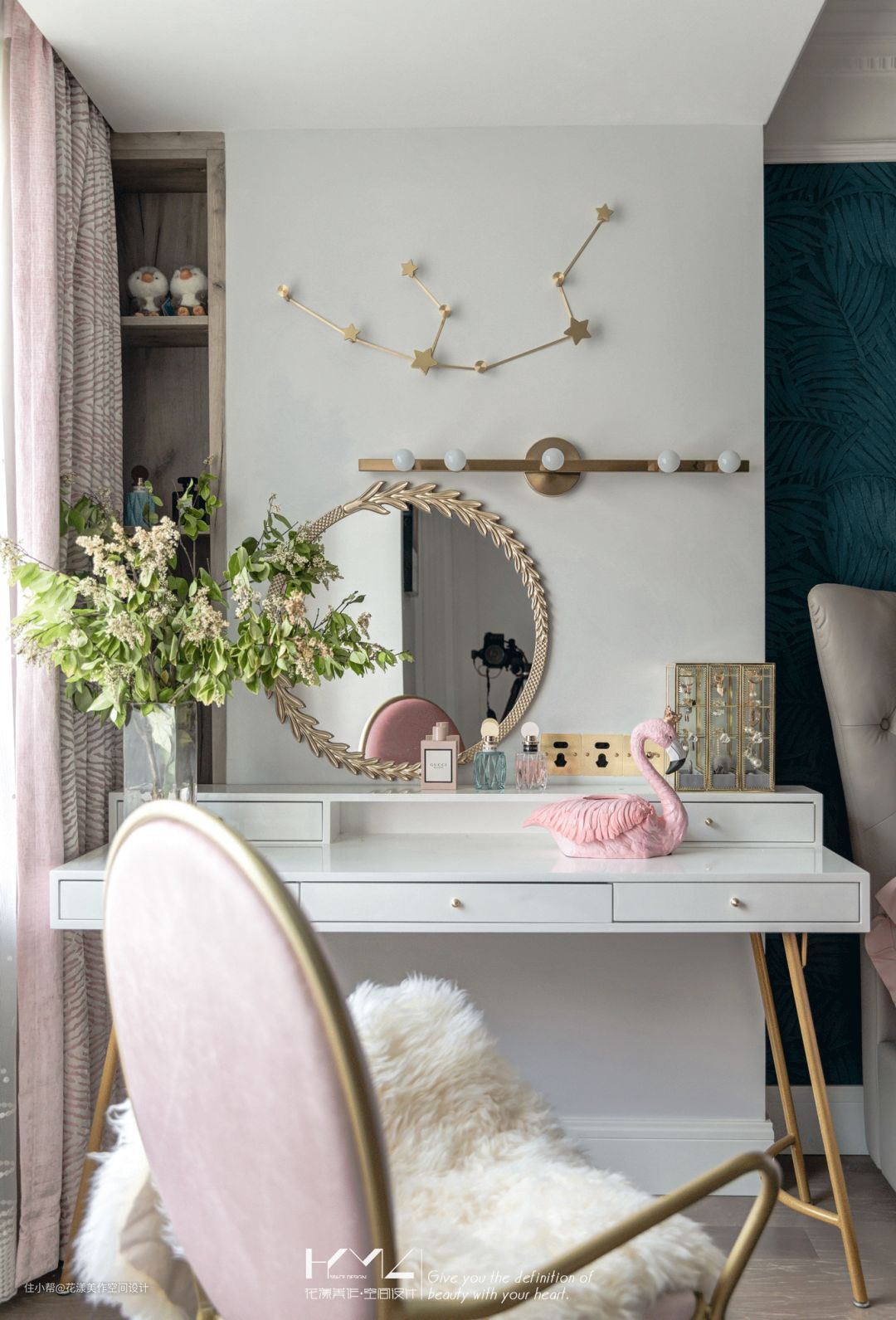▼妆台是我们女业主使用频率最高的地方,我们选配了1.4m双层收纳妆台。墙角内凹的空间,我们也利用起来做壁龛,可以给业主做美容产品的收纳空间,虎皮纹的粉色窗帘+波点装渐变的纱帘,粉色绒布高背化妆椅,绒毛坐垫舒适温暖的柔化了金属框的硬朗,除了美,还是美。