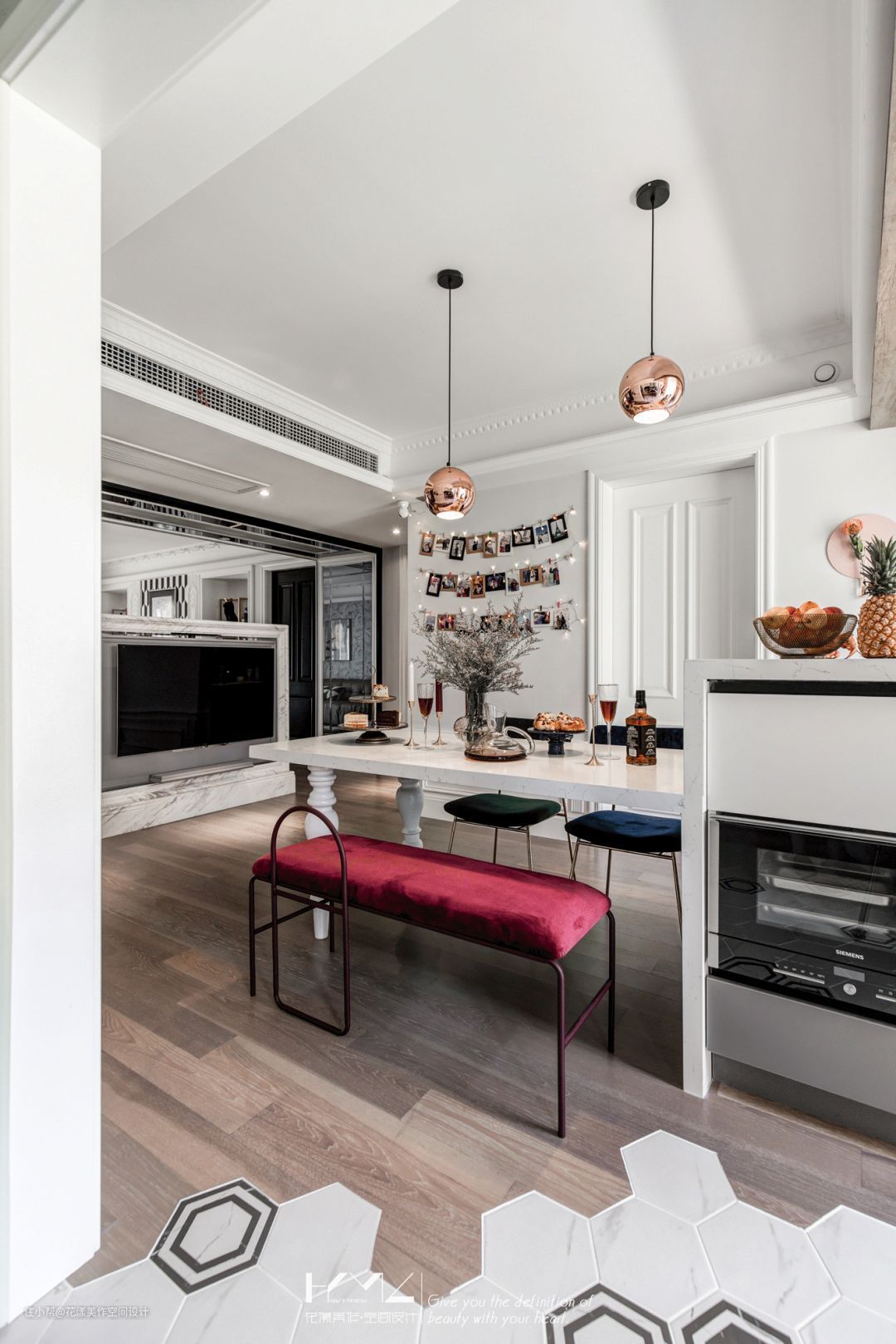 所以,我们在做平面规划的时候就打破常规,给客户创造了一个新奇的家居体验空间,这套方案我们采用很多新的设计形式,例如,客餐厅之间360°旋转电视机架,客厅与阳台之间的心型雕花门套,餐厅的餐桌与岛台一体化设计,六角地砖与长条实木地板无缝拼接,各种比例雕花pu护墙,主卧的渐变玻璃隔断等等……都是体现我们这套作品呕心沥血的独特之处……