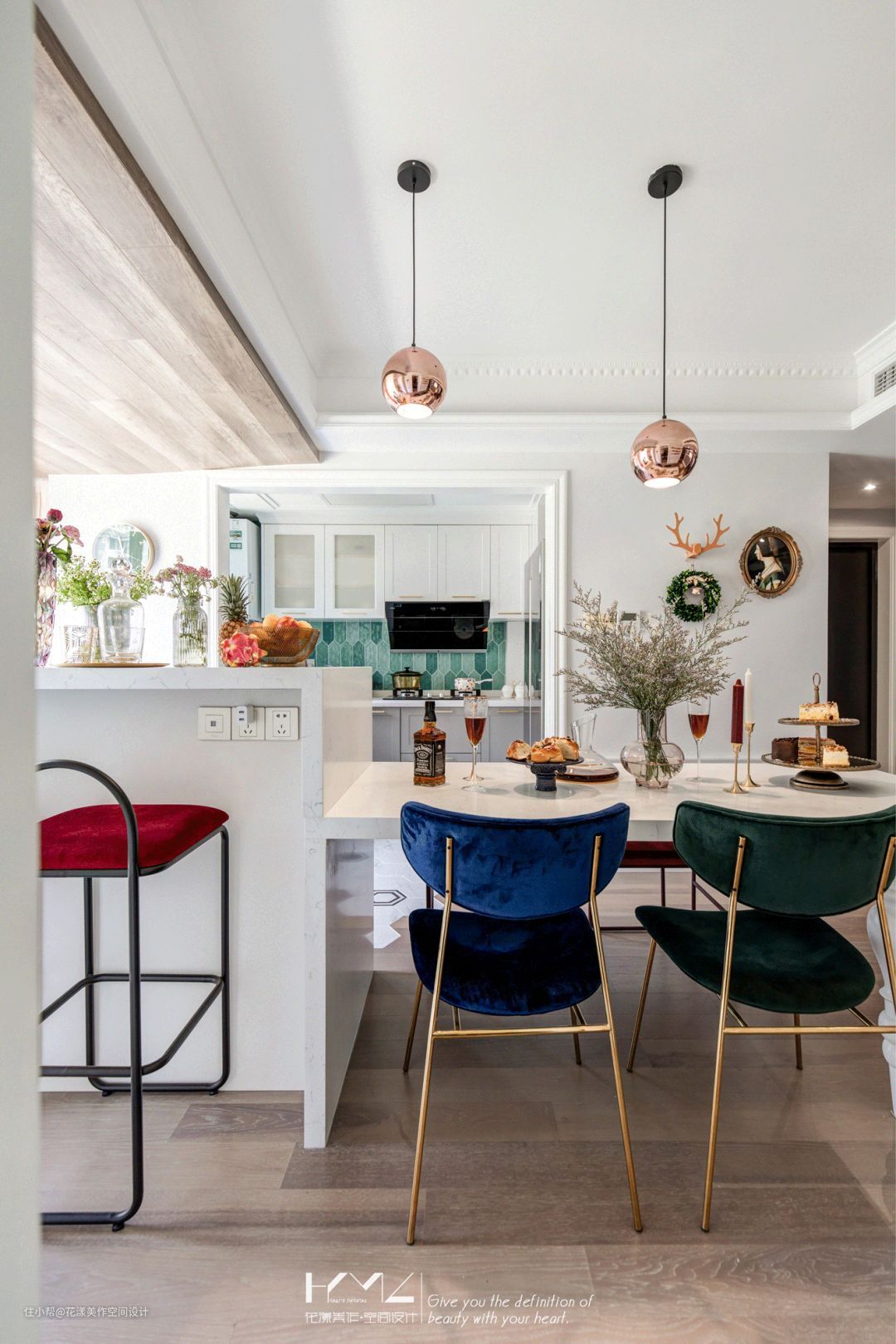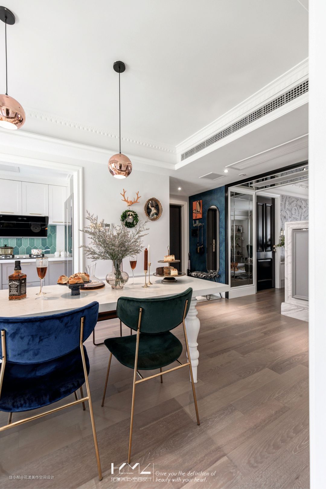 餐椅选用了宝蓝+祖母绿+豆沙红的搭配,亮面钛金不锈钢腿,不占空间同时又轻盈时尚。