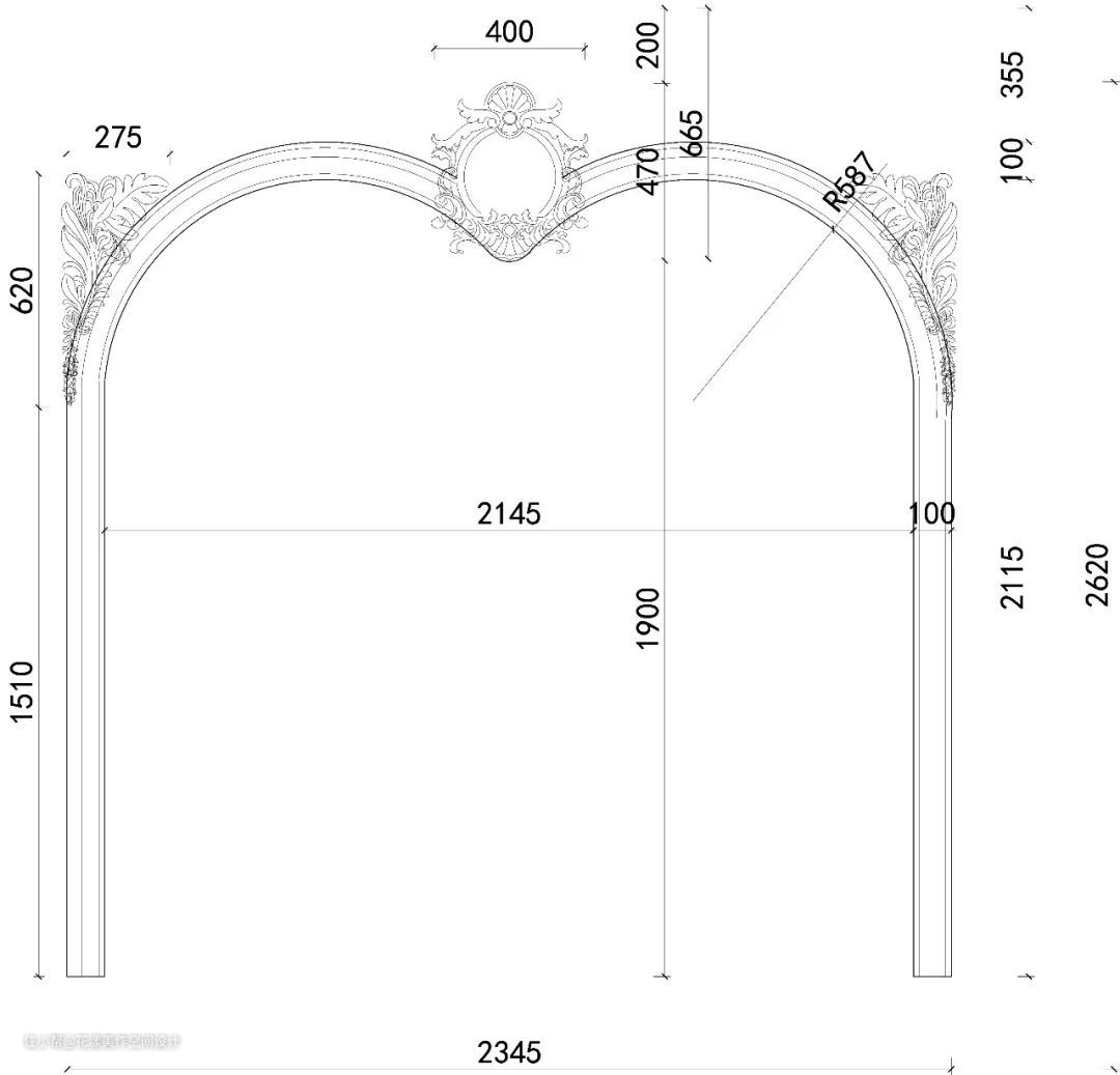 ▼心型门套具体尺寸,定制这个过程十分艰辛,因为造型特殊,造价偏高,找了很多家都不做,最后找了卡子门红星店【西格美】木作店,中间的雕花头,和两边的花角线也都是特别定制。