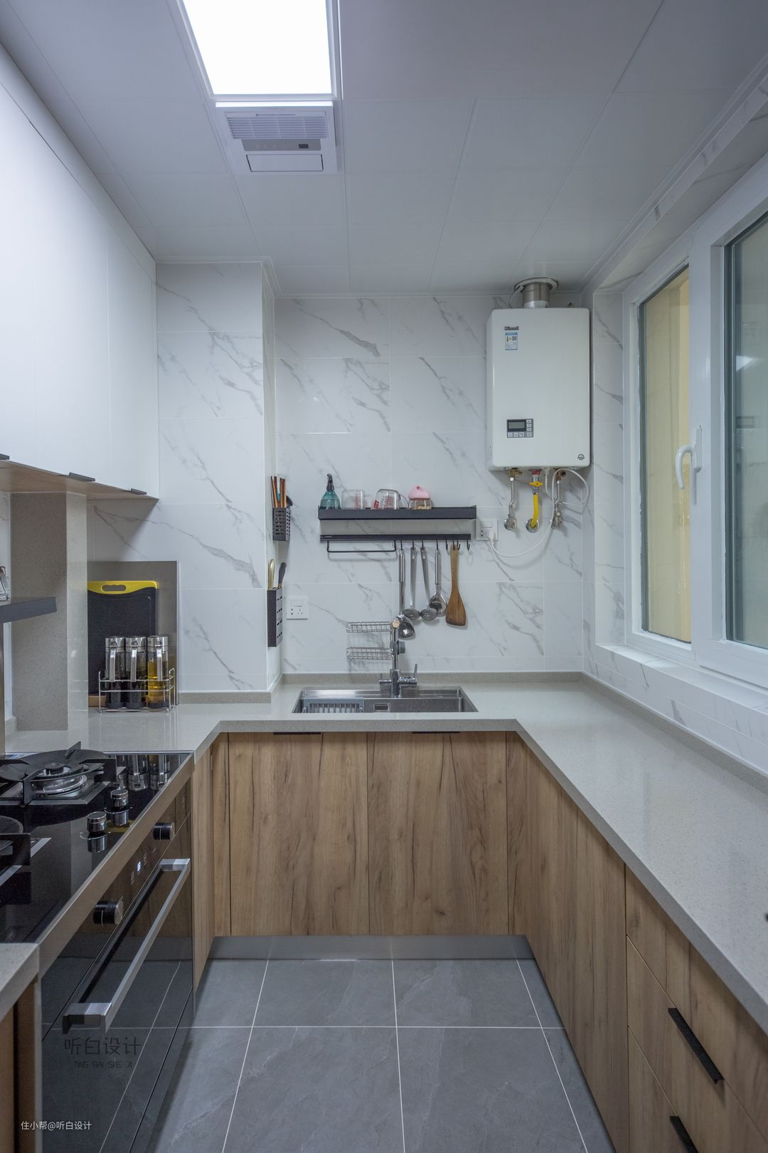 做了一个U形的厨房,让厨房井然有序。靠窗的尺寸是深度42公分,可以完成切菜摘菜等各方面的需求。