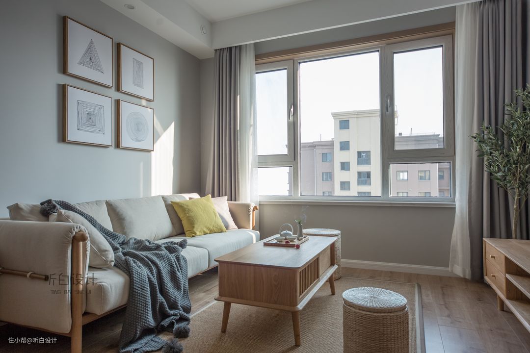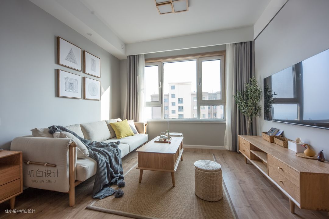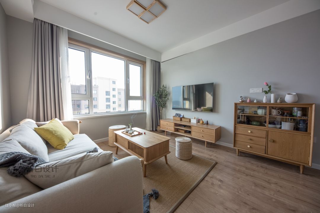 灰、白色的窗帘与整体的色调相融合,保持整个空间淡雅致、朴素的格调,回归自然。电视背景也无任何装饰。