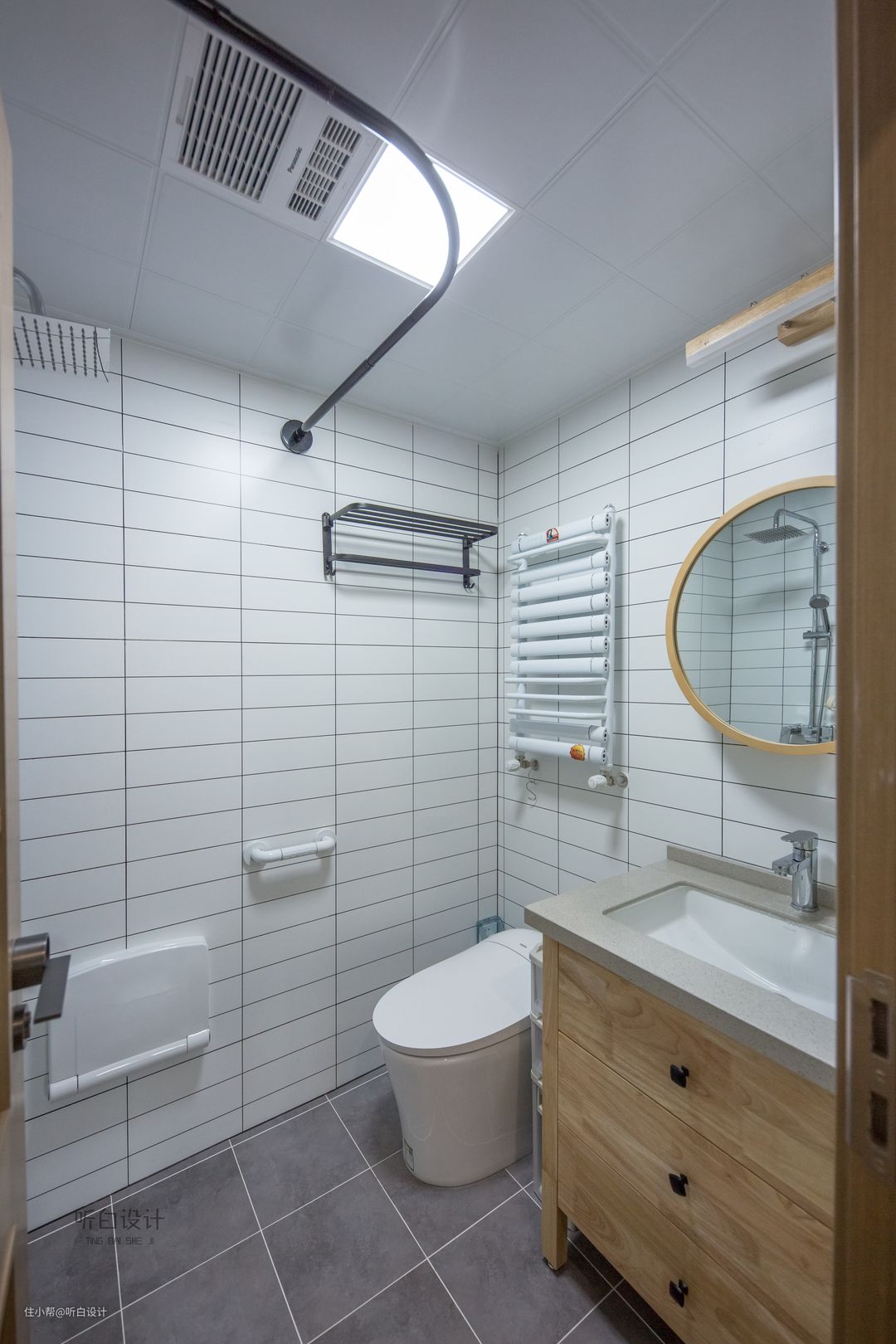 卫生间地砖选择灰色,比较好收拾卫生,白色的墙砖也能显得明亮一些。安全扶手、坐浴凳等细节的设计,安全舒适,有老人的家庭可以做为参考。