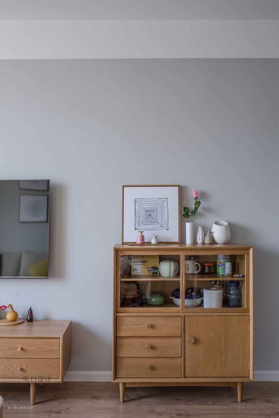 原木的电视柜与餐边柜错落摆放,还有绿植的点缀,简洁而不失层次,自然且充满活力。