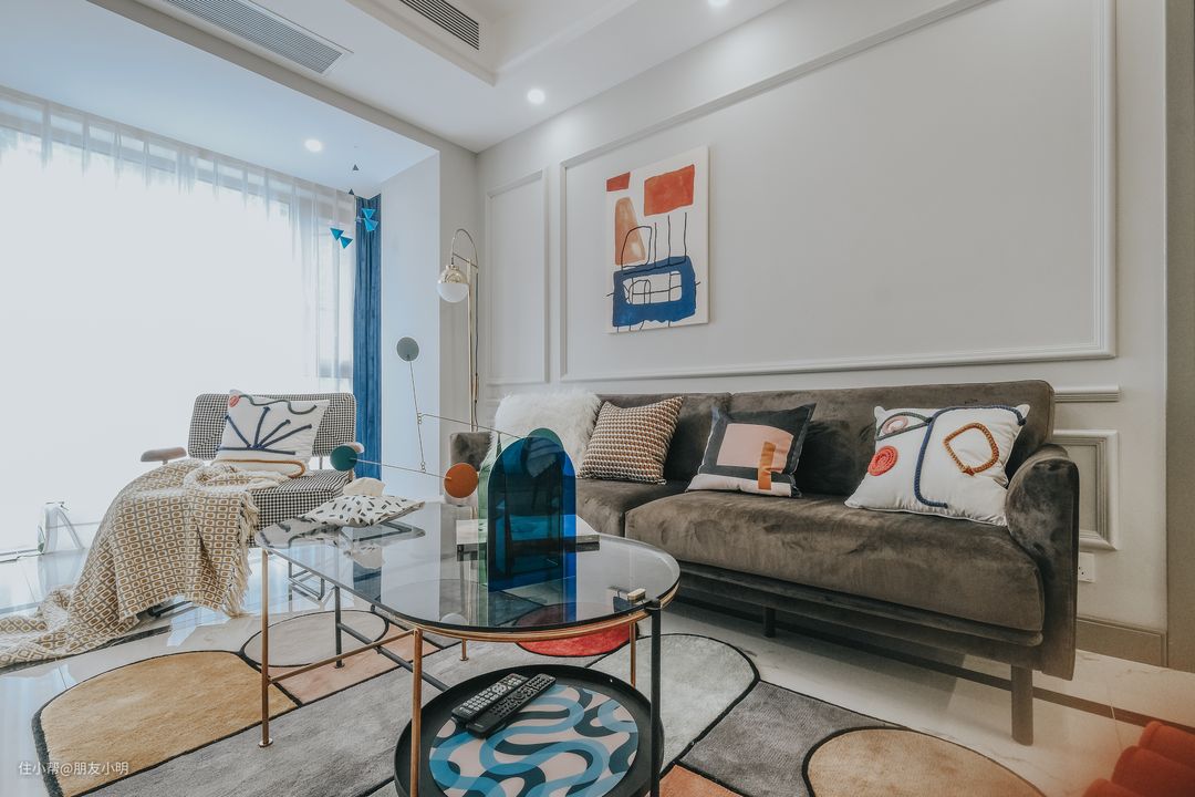 客厅主题基调以浅色系为主,灰色的墙面和大理石纹的地砖,色彩的丰富更多是通过家具软装突出,如果以后想换种感觉,直接更好家具就好了,方便。