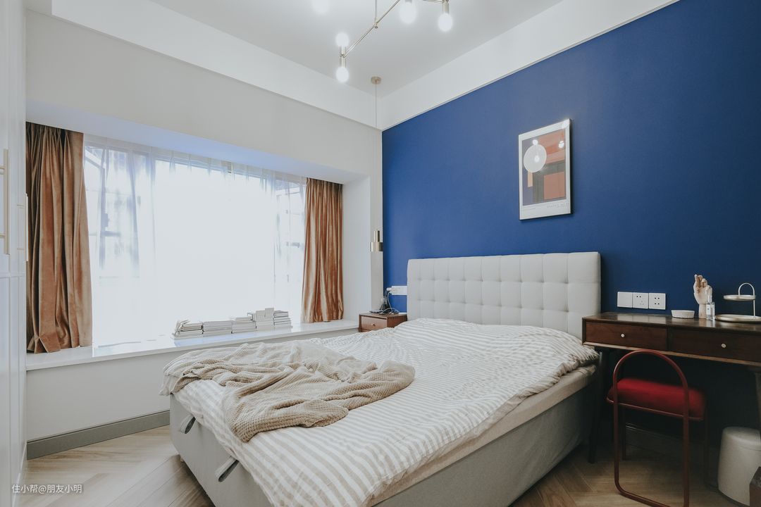 卧室蓝色墙面分色,增加视觉多样性,让空间暖起来