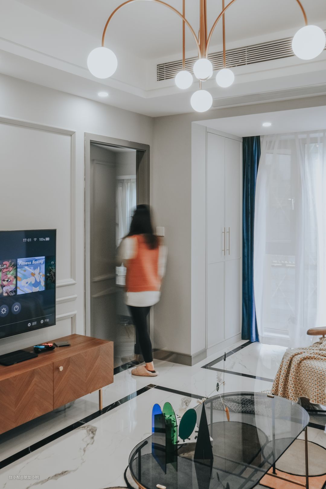 电视柜也选择了胡桃木色洗,金属柜脚增加金色元素,显得更加精致