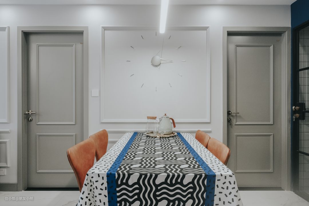 餐厅摆放的家具都很简单,尽量要求能透过物体看空间,所以餐桌和餐椅都是几根线条搭配座椅,桌布是我淘了很久的,几何线条系列,质感很舒适