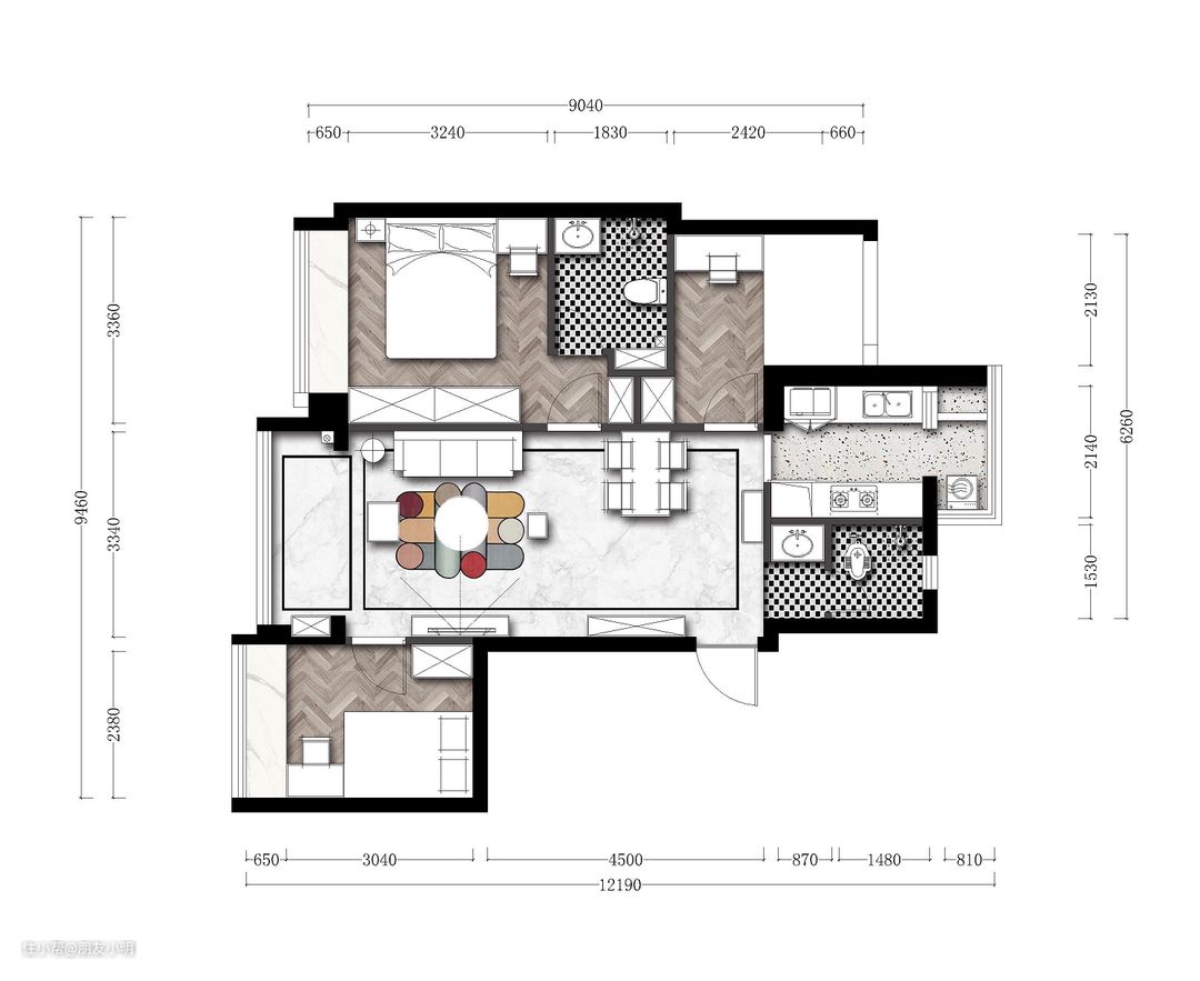 客厅主题基调以浅色系为主,灰色的墙面和大理石纹的地砖,色彩的丰富更多是通过家具软装突出,如果以后想换种感觉,直接更好家具就好了,方便。