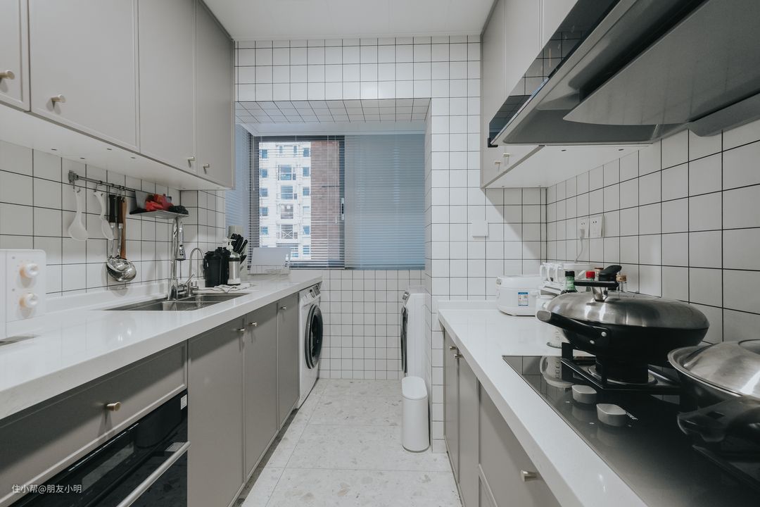 解决方案:打通阳台墙体,扩大厨房面积,置入烘洗一体机,保留阳台