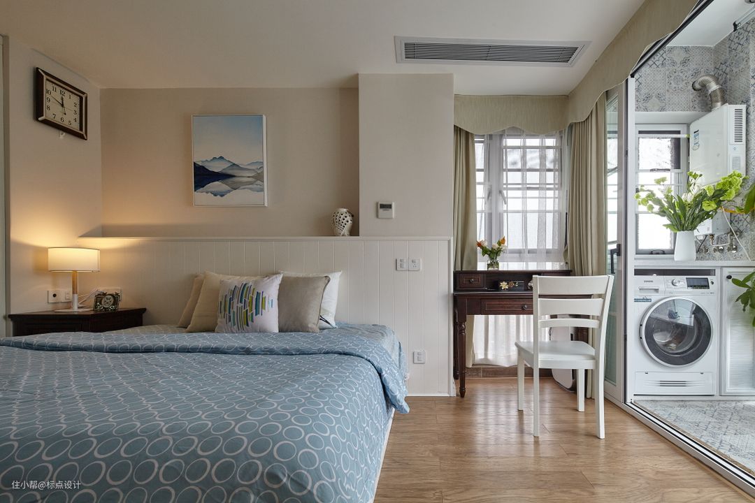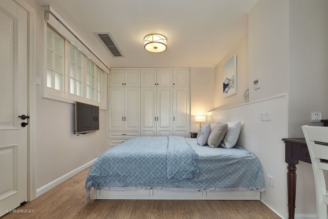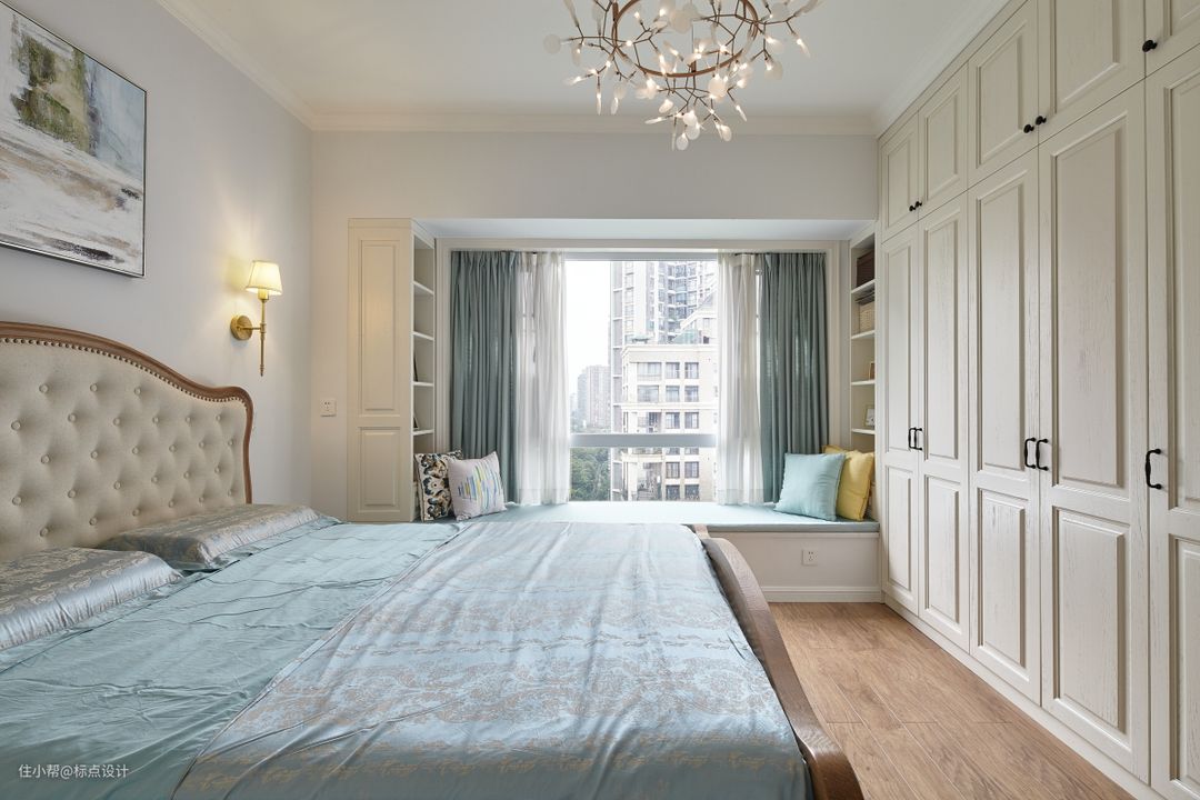 装修后这里变成了主人房,拥有一个小的独立衣帽间和一长排大衣柜,1.8米的大床,也让这个空间不拥堵,飘窗也改成了主人休闲看书的地方。