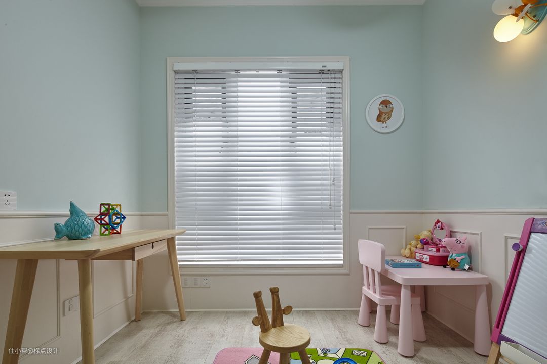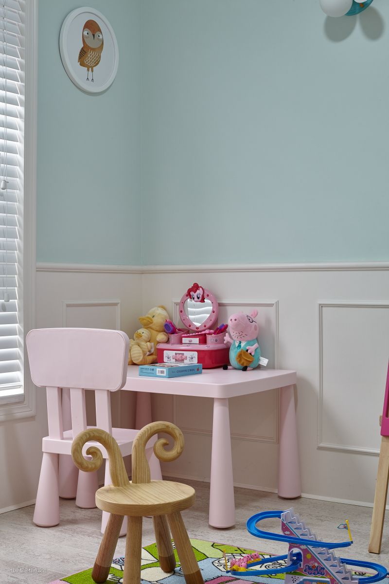 儿童房如同童话世界般美好而纯真,在粉绿治愈墙面与米色墙裙的包裹中,是爱丽丝仙境般的视觉空间,设计师在整体空间布局与色调把控上更“自然化”,贴近小朋友的视界。