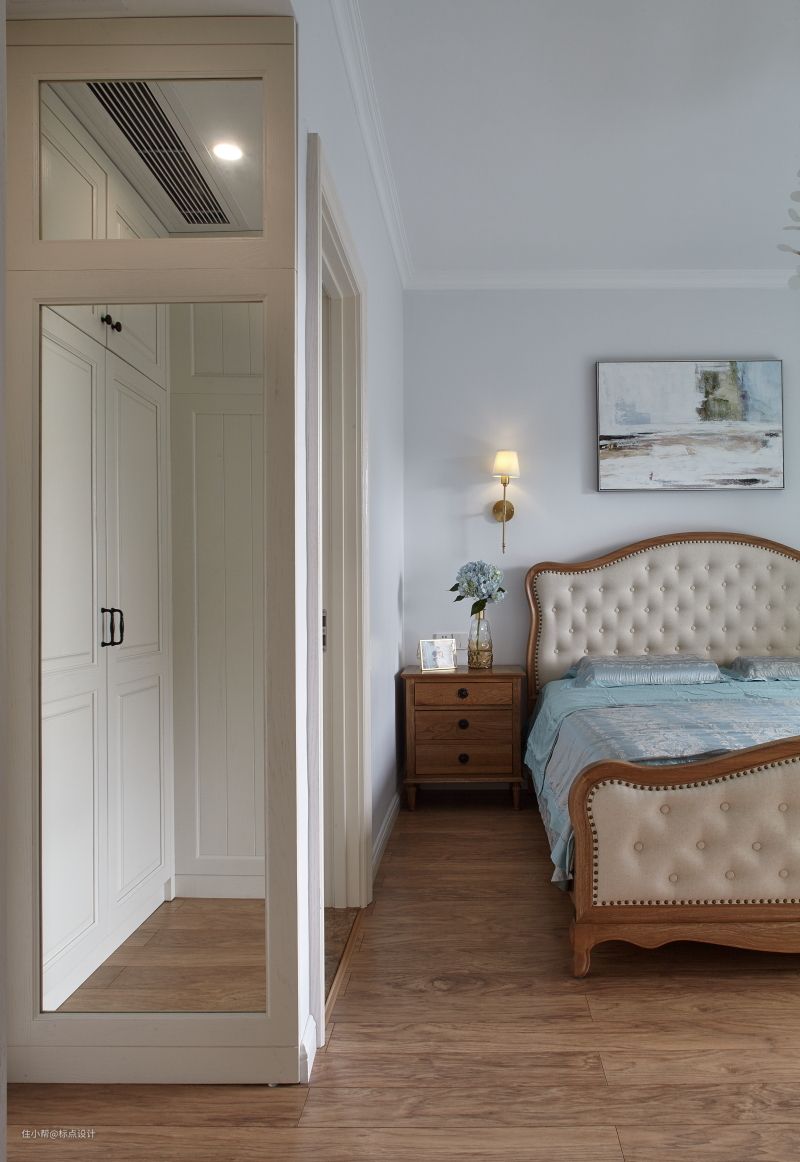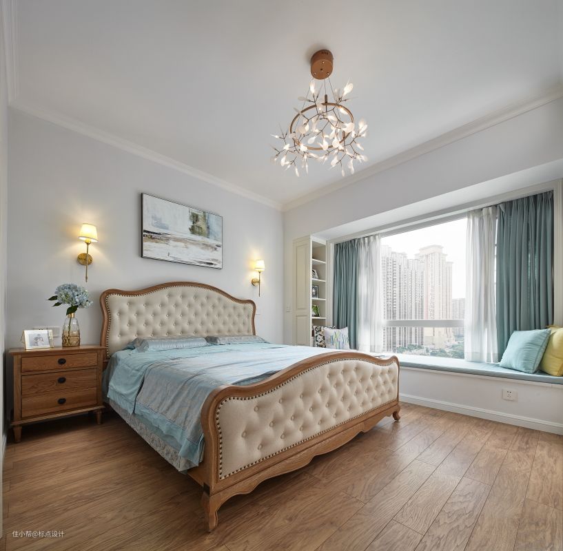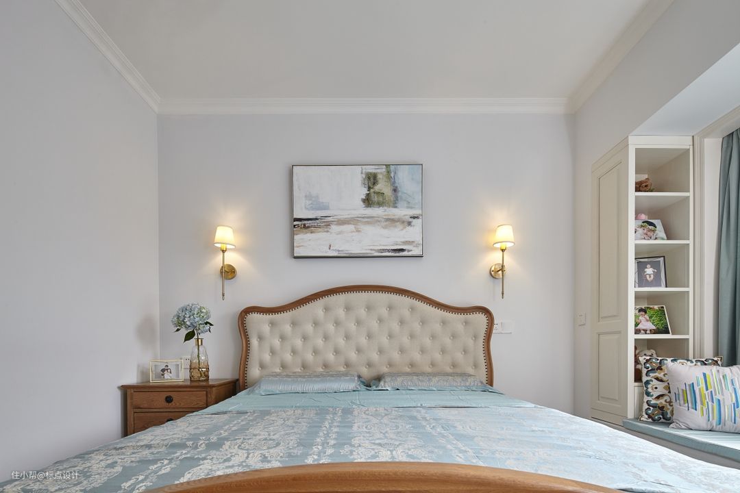 设计师用柔和的治愈色系为主卧勾勒出了最雅致且安逸的一笔。颇具艺术感的吊灯下,粉蓝色轻轻擦过抽象画的一角,落在优雅的绣球花上,落在舒适的大床上,也落在洒满阳光的飘窗上......