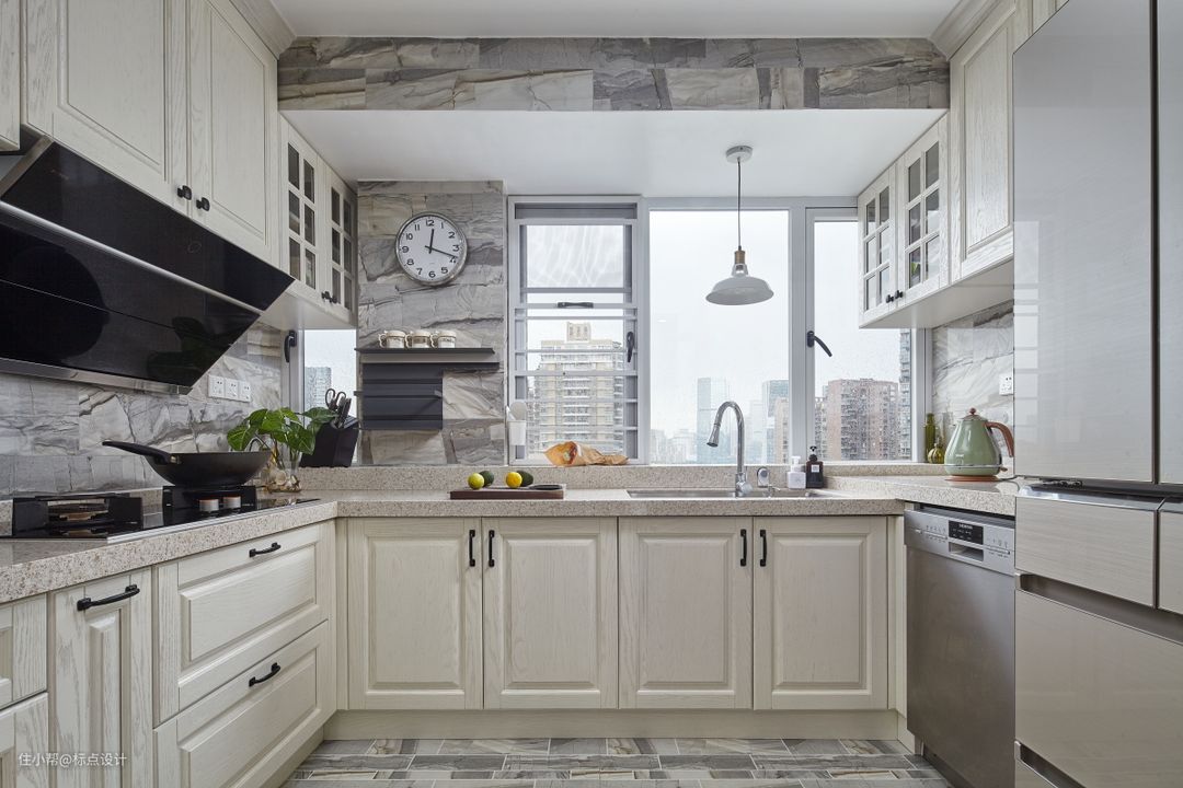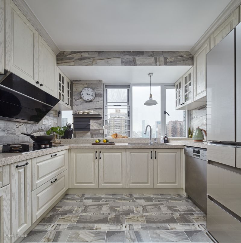 厨房选择U型橱柜操作台,给居家烹饪提供了更多的活动空间。复古色的瓷砖不仅提升了整体空间质感,不规则铺贴的手法更凸显了设计感。