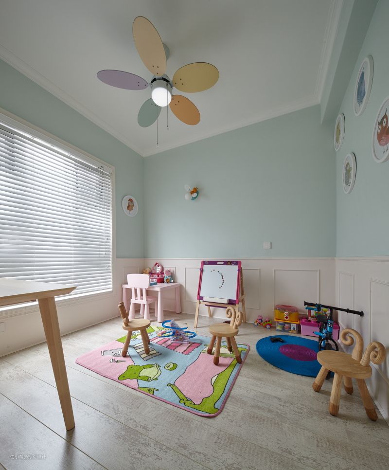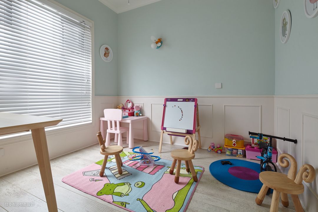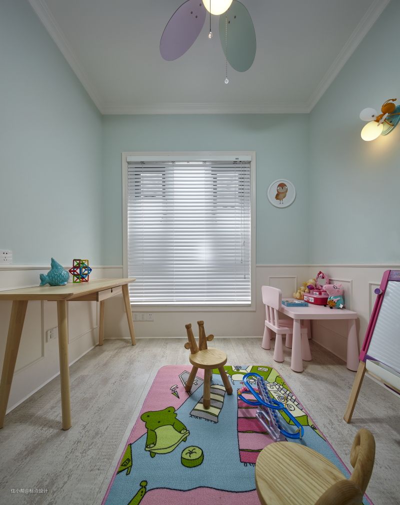 儿童房如同童话世界般美好而纯真,在粉绿治愈墙面与米色墙裙的包裹中,是爱丽丝仙境般的视觉空间,设计师在整体空间布局与色调把控上更“自然化”,贴近小朋友的视界。