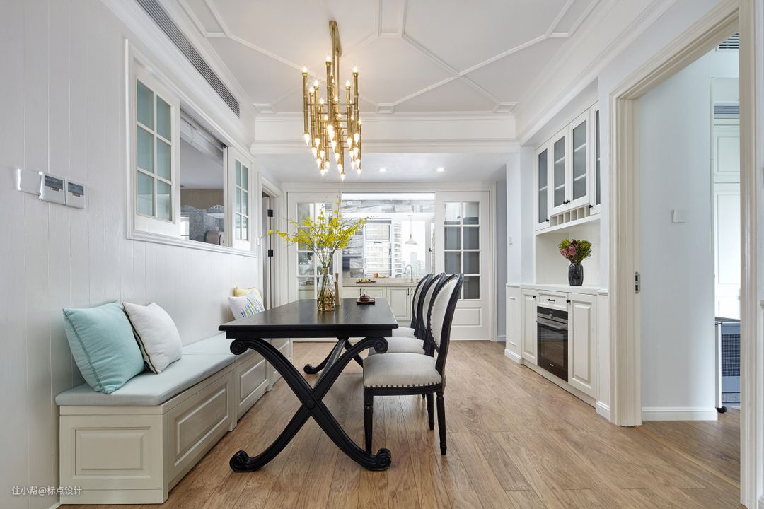 文艺白的大手笔启用让客餐厅显得清新明亮,嵌入式收纳柜预留出了大量过道活动空间,餐厅与厨房的开窗设计则提升了空间互动性。