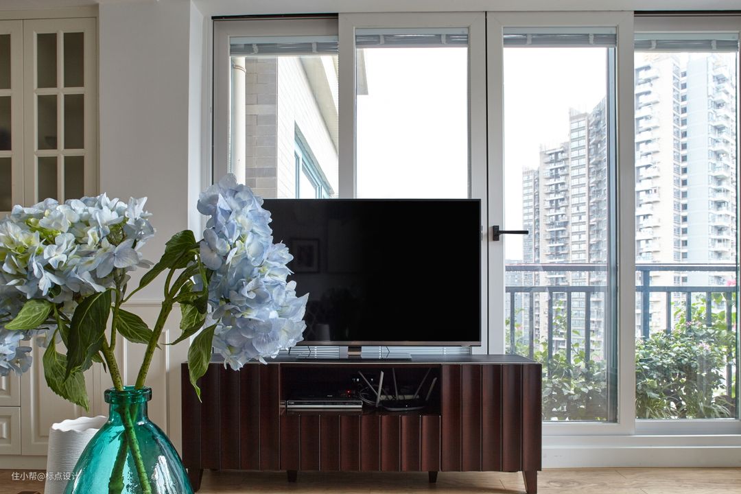 进门后的这块空间原来是入户花园,为了更好的利用空间,我们把这里改成了客厅空间 , 为了解决电视靠窗的问题,我们选择了一款在玻璃中空夹电动百叶的窗户,这样就解决的光线的问题,同时也避免了百叶不好打扫卫生的问题。