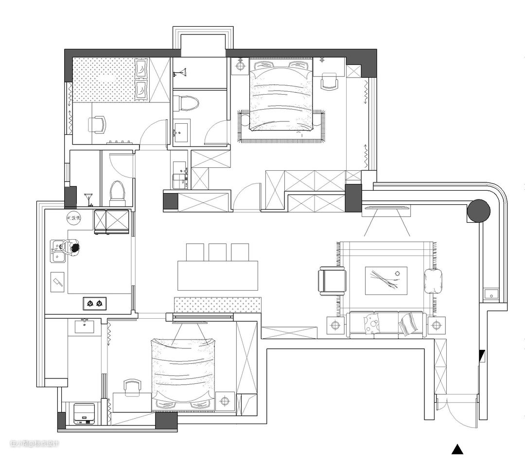 2、原始的过道和公共空间占去房子的大部分面积,使得每个卧室空间都很狭小,也很压抑。同时公共空间的不合理规划让公共空间也很凌乱和不舒适。