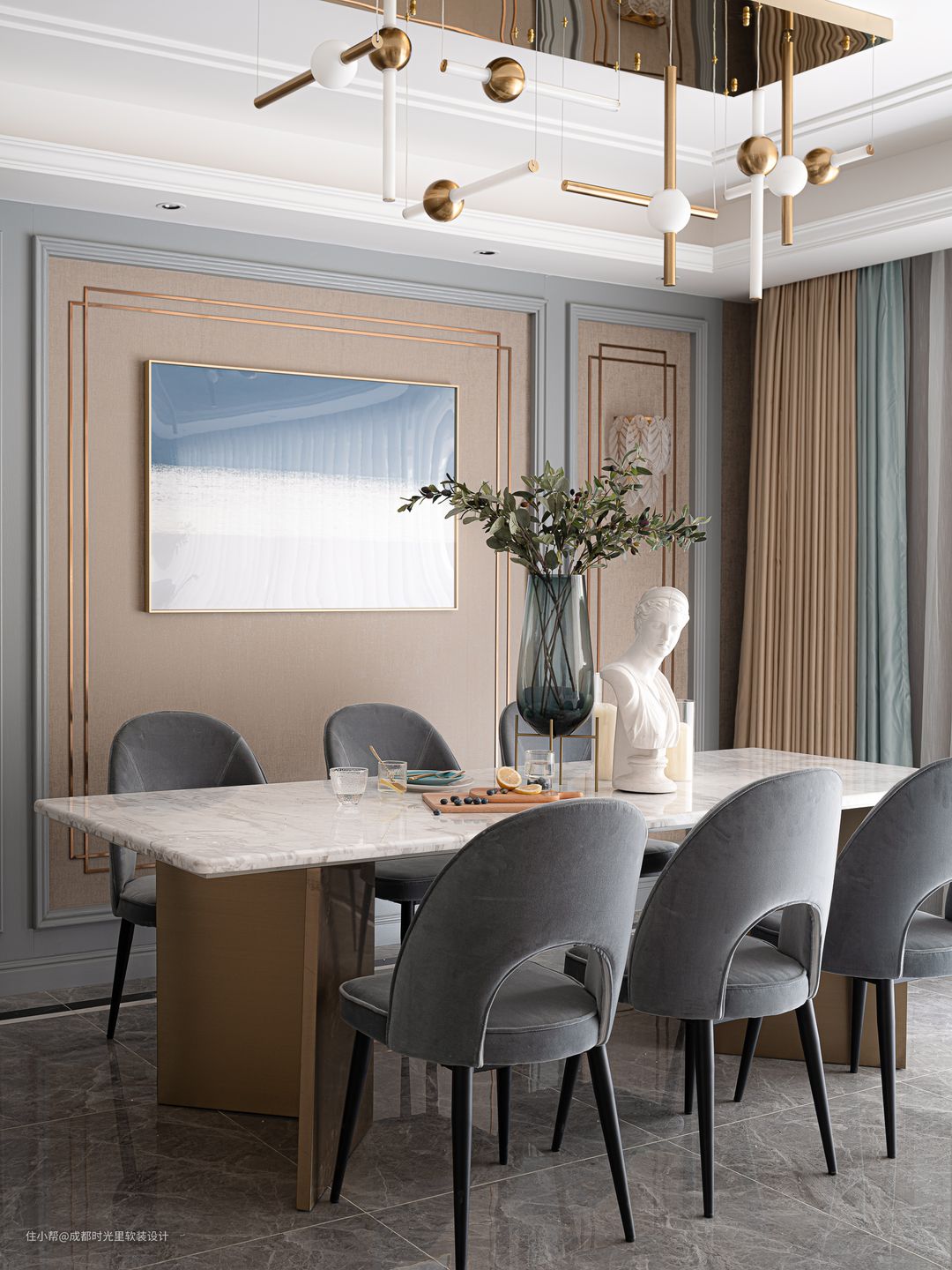 墙面挂一幅蓝白色调的装饰画,结合白色大理石餐桌,配上意大利进口绒布的餐椅,让整体雅致的空间,显得更加端庄优雅。