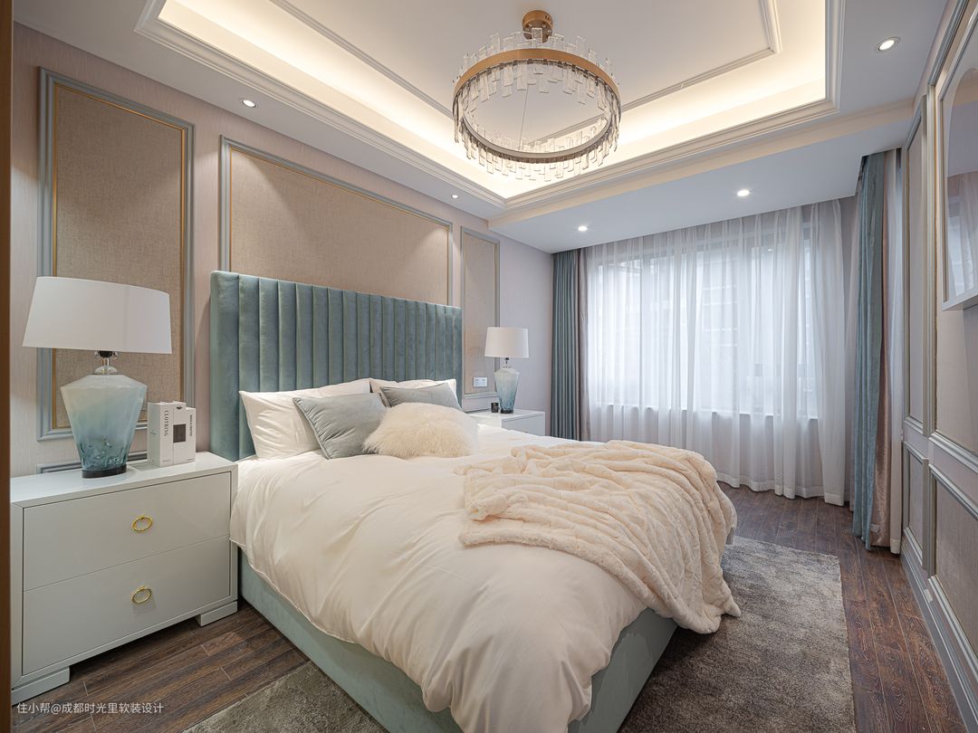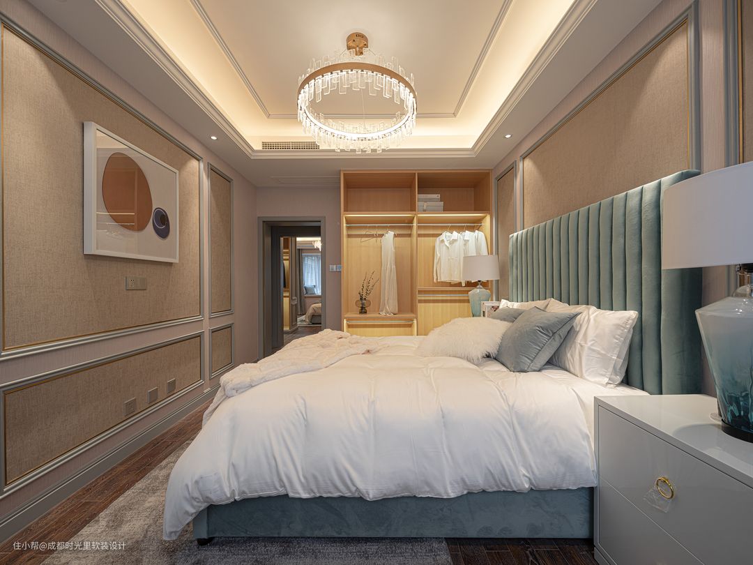 次卧的设计延续了整个主题风格,细节处尽显优雅,选用高靠背的床,让整个空间更加大气,以淡蓝色为主色调搭配柔软的白色床品,加以圆形灯具的点缀,让空间透露出轻奢优雅的舒适氛围。