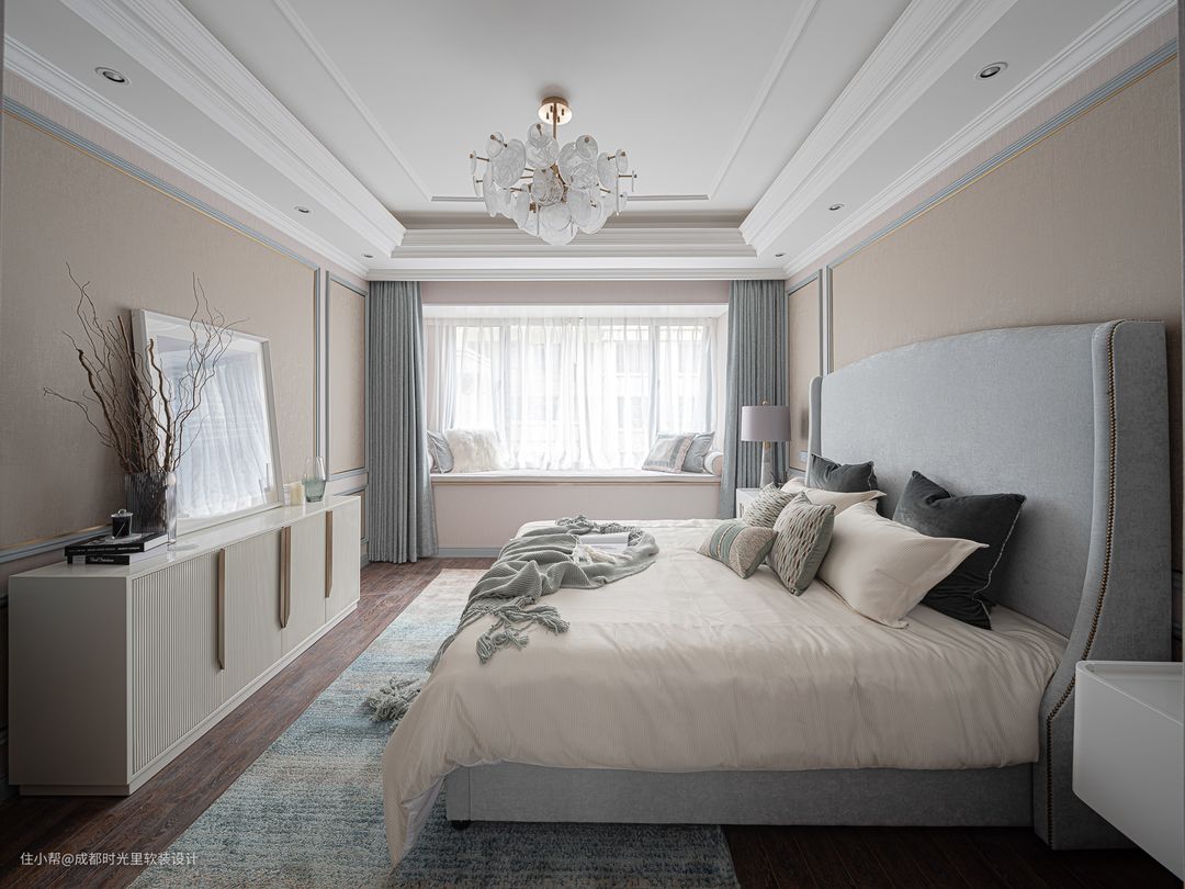 飘窗的巧妙设计,不仅满足了床尾凳的功能,同时也最大化利用了主卧空间。