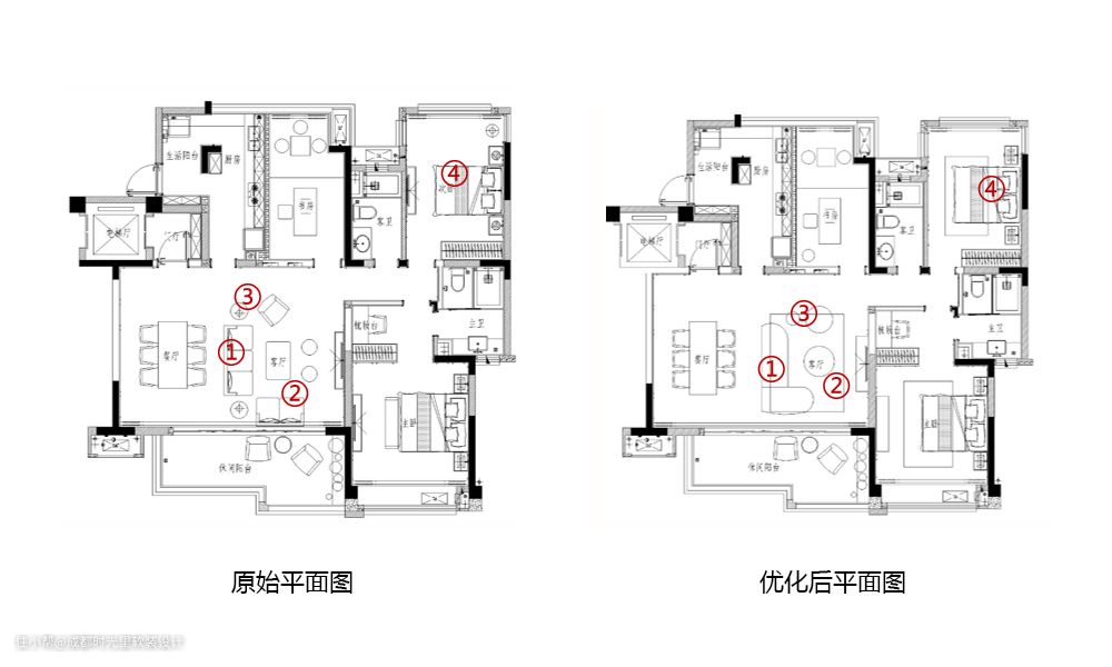 2.主沙发的妃位部分代替原有的双人位沙发,换用圆形茶几,增加空间美感。