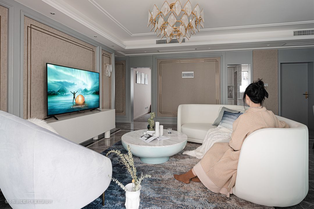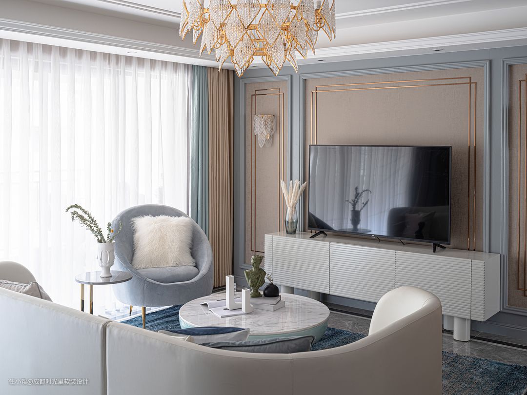 通过沙发材质、窗帘色泽、灯具造型的巧妙搭配,使轻奢风格既有现代与艺术的融合,又有潮流与时尚的精致。