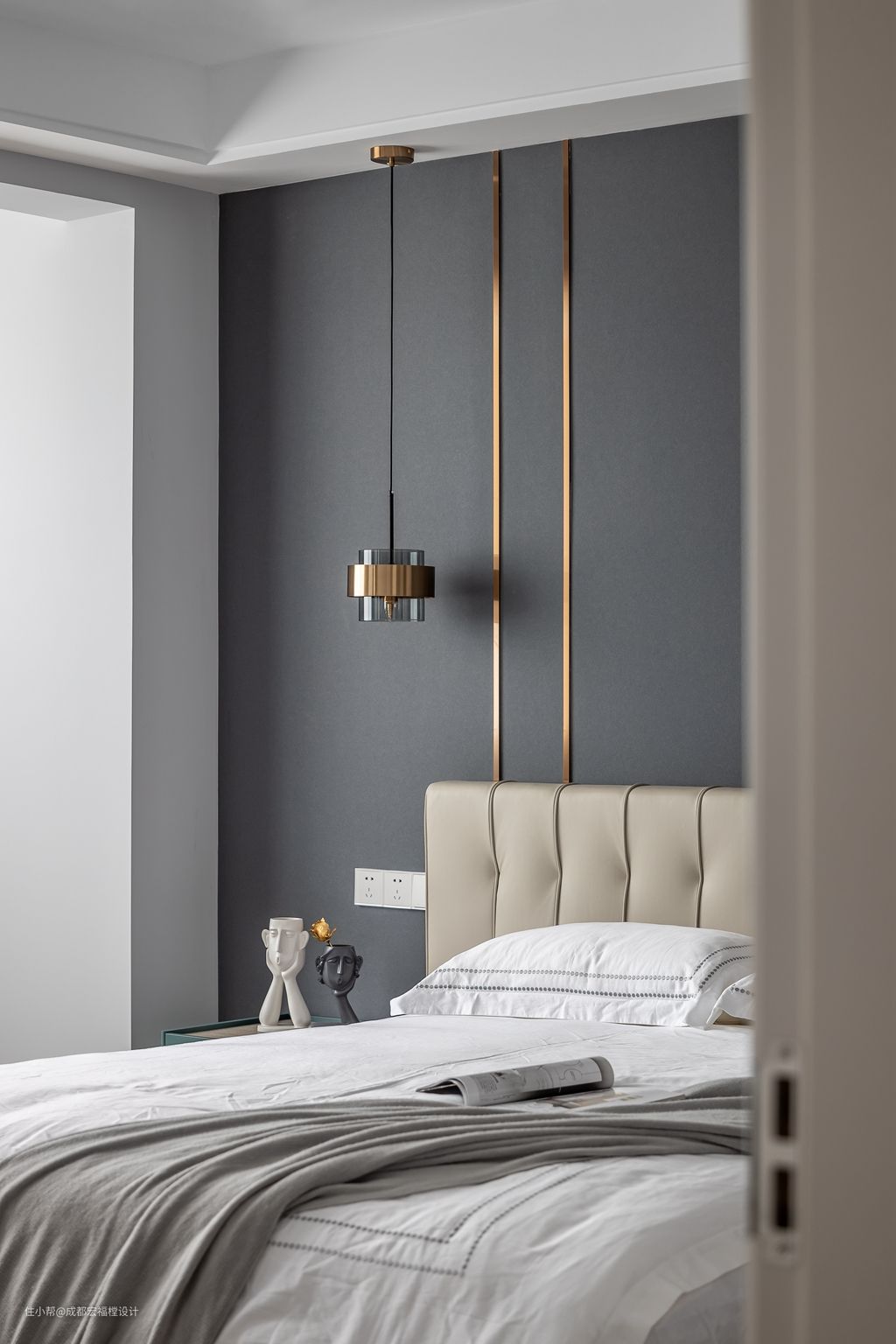 主卧面积宽敞,一整面窗户带来了极好的采光。整个空间色彩简约淡雅,穿插一些金属元素避免了乏味。#卧室 #床 #吊灯 #沙发