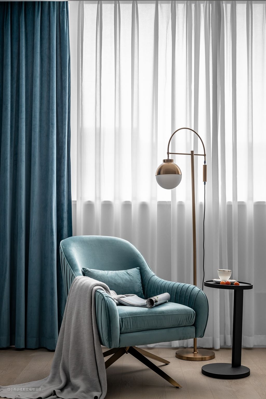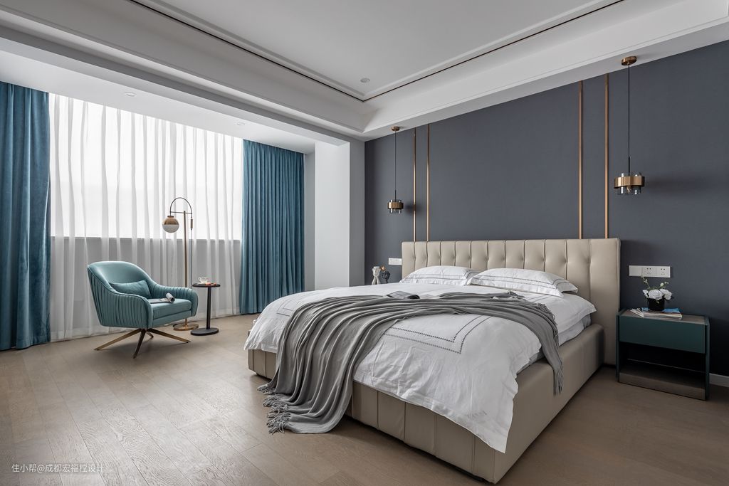 水蓝色的窗帘与沙发让空间更放松,增添了卧室中的舒适与惬意感。#卧室 #沙发 #窗帘