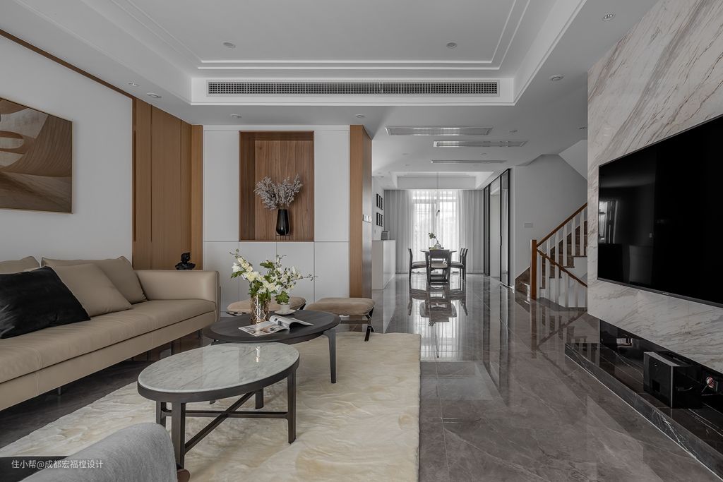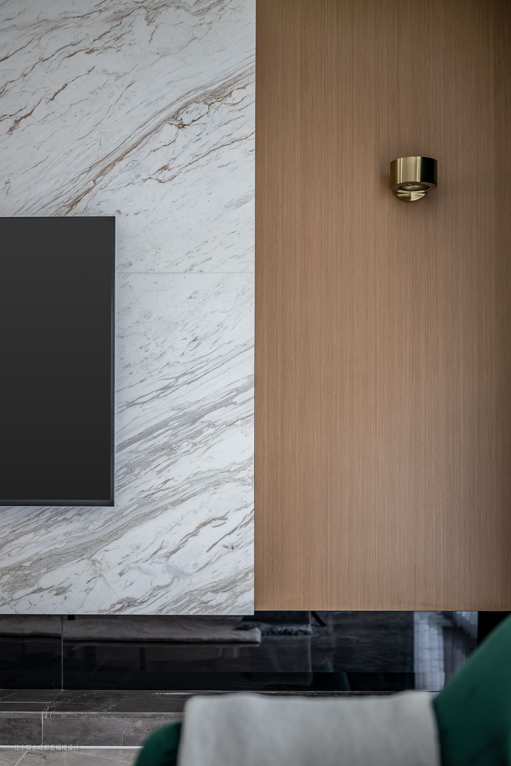 为了避免客厅直接看到客卫,所以我们重塑了电视墙位置。电视墙选用大理石材,质感沉稳,与空间相呼应。且简洁亦打扫。#电视墙 #大理石