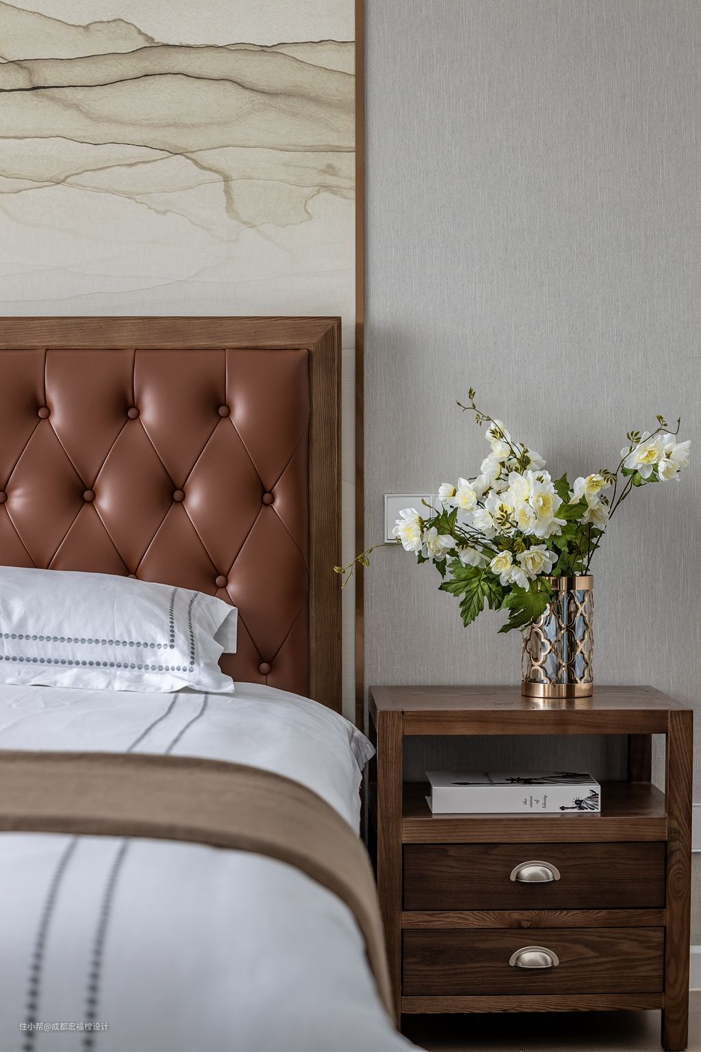 次卧虽为老人居住,但在风格上不希望做的太传统。于是选择皮质软包床而又在墙上融入了一副中式画,传统又不失现代感。#卧室 #床 #床头柜 #挂画 #窗帘