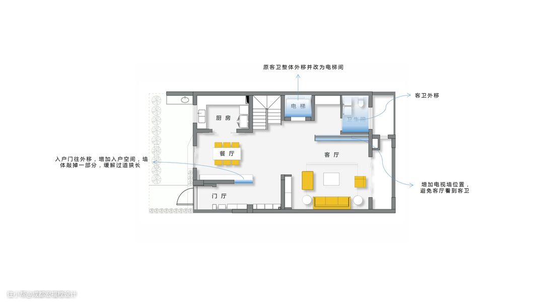1.外走廊过长,内部玄关面积局促(入户门往外移,增加入户空间,墙体敲掉一部分,缓解过道狭长)