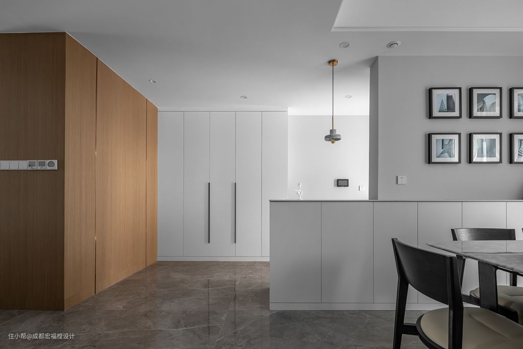 步入玄关,光线很自然的洒进空间。这块区域属于“简洁而不简单”的功能优化设计,能让餐厅区域有一定的私密性,也让空间更明亮通透。#玄关 #吊灯 #柜子