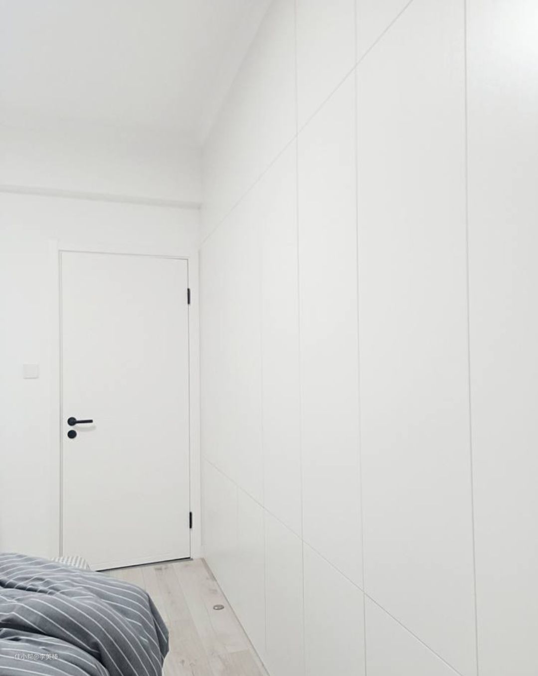 床尾整堵衣柜墙,无拉手,全部弹开器来降低衣柜存在感,有小孩子的家里这样比较安全,也很难想象这么大的衣柜装上三排拉手是个啥感觉。