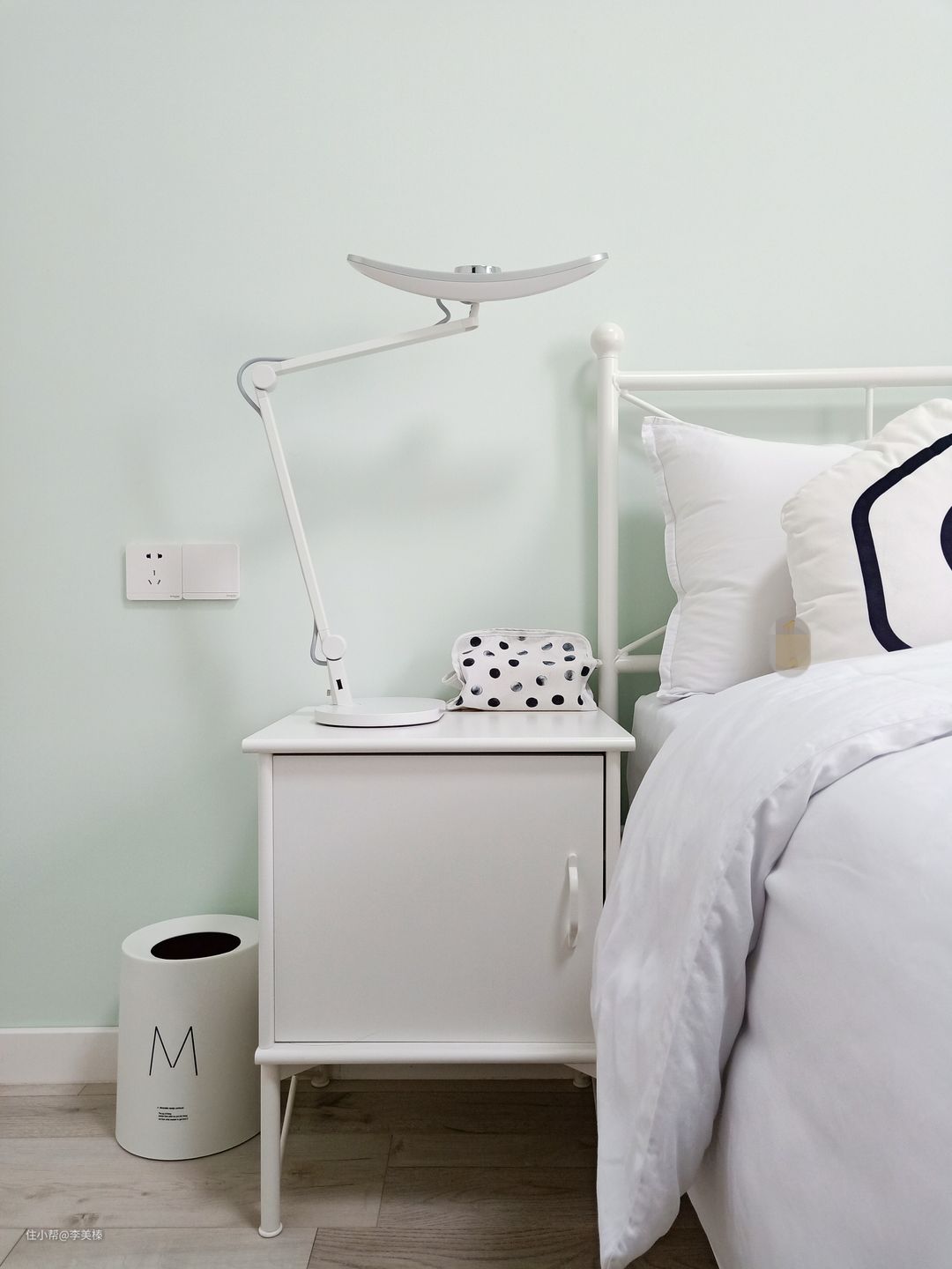 薄荷绿墙面,拍出来颜色变浅了,没有色号,是当时自己调的色。