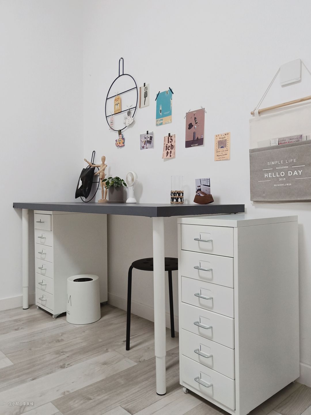 主卧没有梳妆台,加了一个办公桌,这块的空间是属于窄长形的,但是能买到的成品书桌都没有合适的尺寸,最后我灵光一闪,找我家全屋定制的商家做了块150×55的白色板子,上面贴了灰色的贴纸,自己在宜家买了可调节高度的桌腿,用螺丝拧上以后自己diy的书桌便搞定了,总造价才360块钱,算是很实惠了。