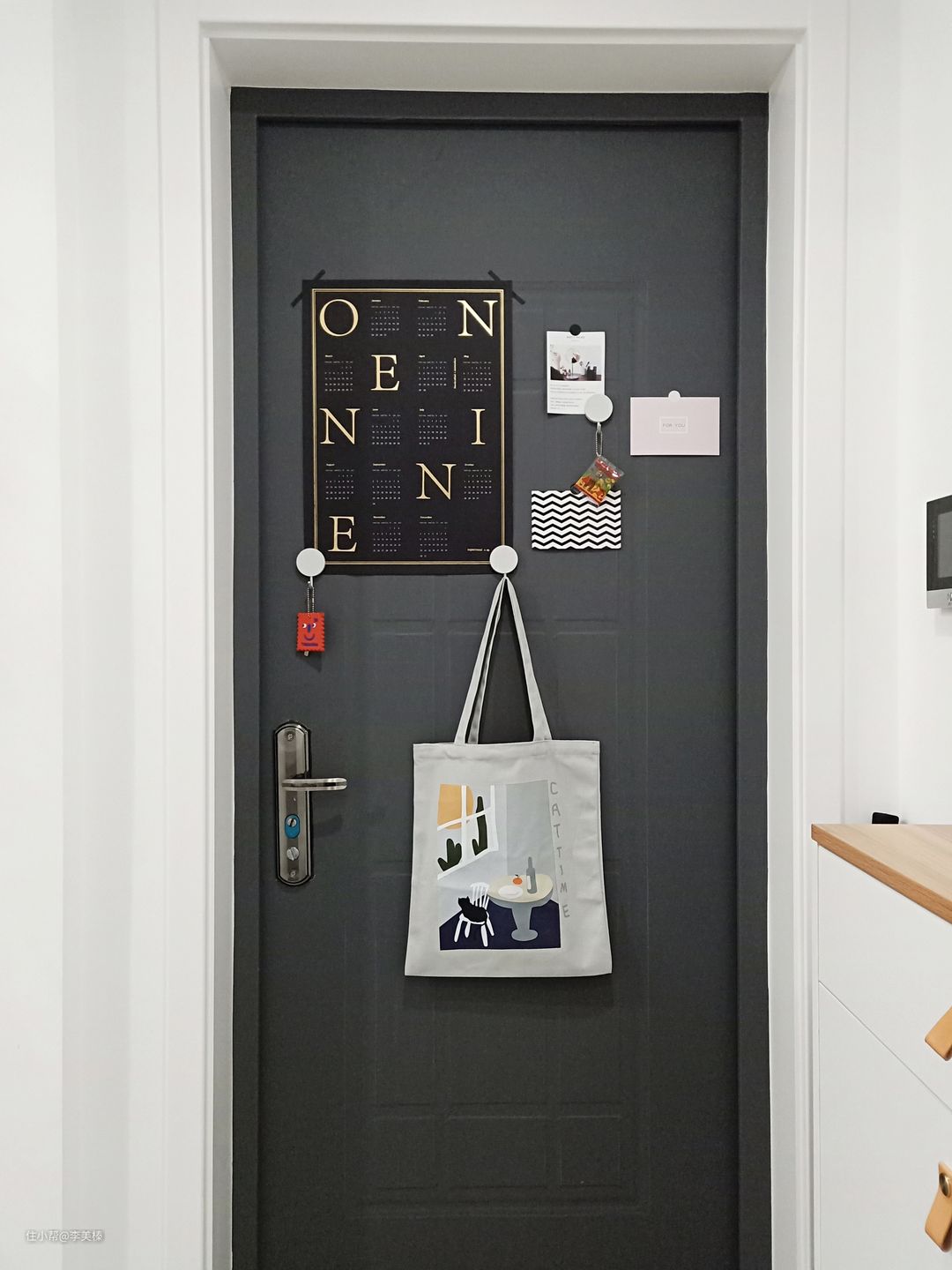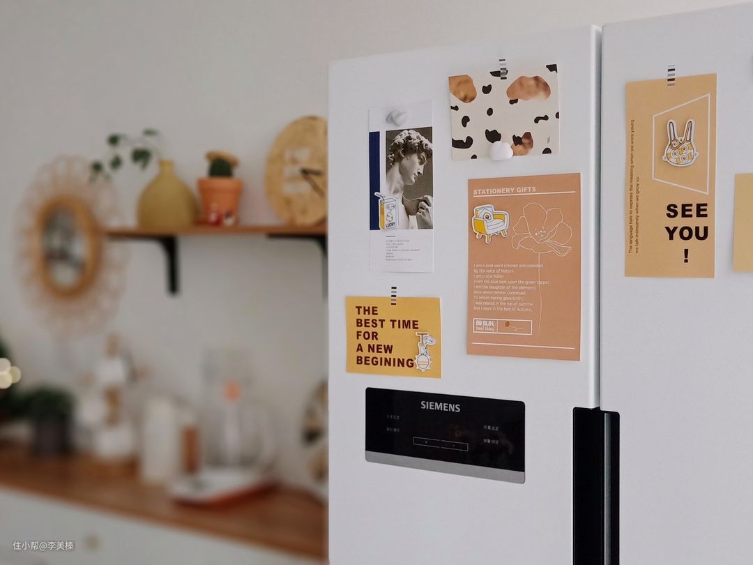 贴纸手工改造的猪肝入户门,贴纸虽然便宜,但改造后的效果并不廉价,反而还很有质感,颜值蹭蹭上了几个等级,随意贴几张卡片装饰,用挂钩做收纳,重点是磁吸挂钩可重复利用,卡片也可以随心换,毕竟常换常新是家居永恒不变的主题。