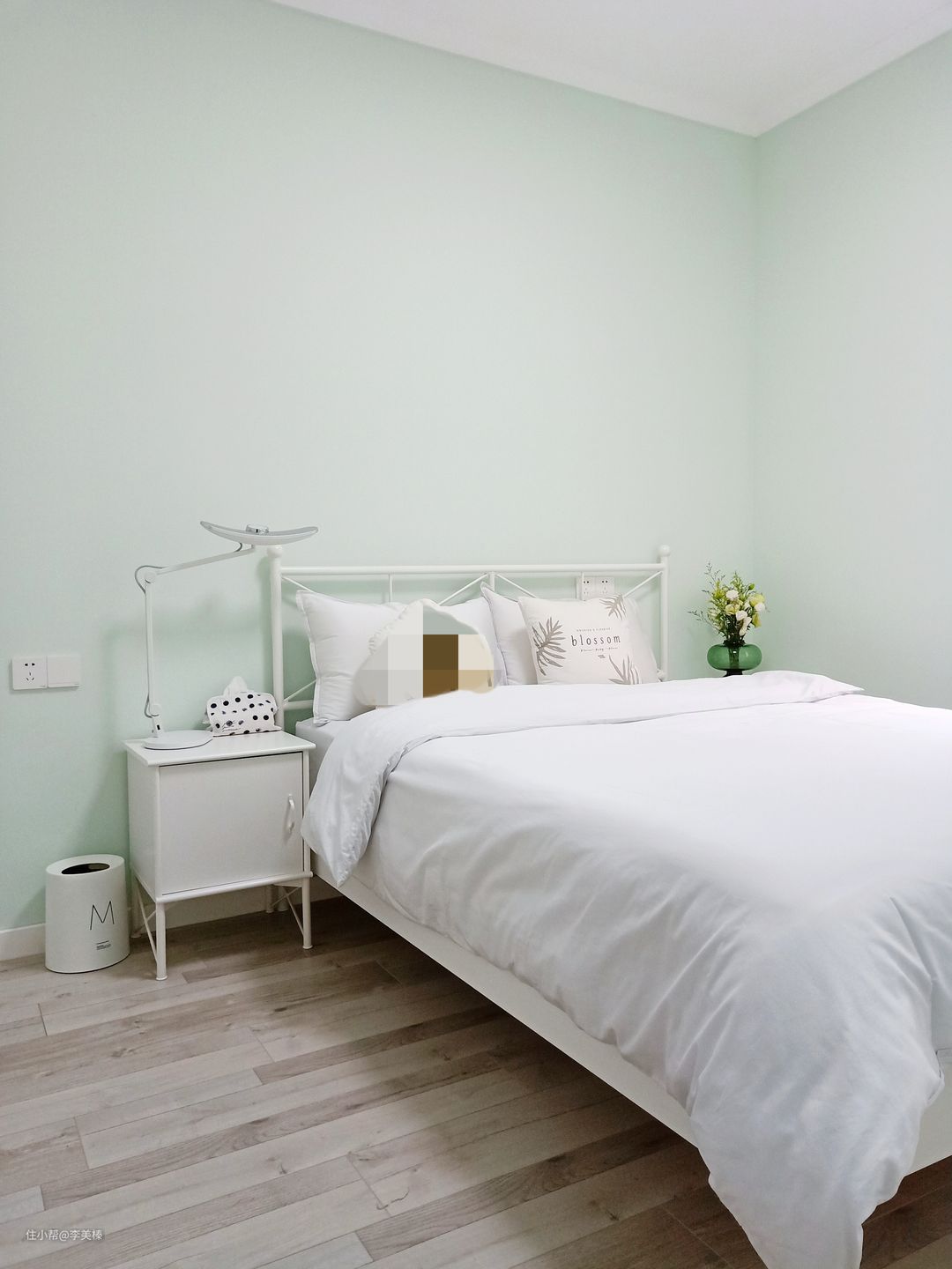 薄荷绿墙面,拍出来颜色变浅了,没有色号,是当时自己调的色。