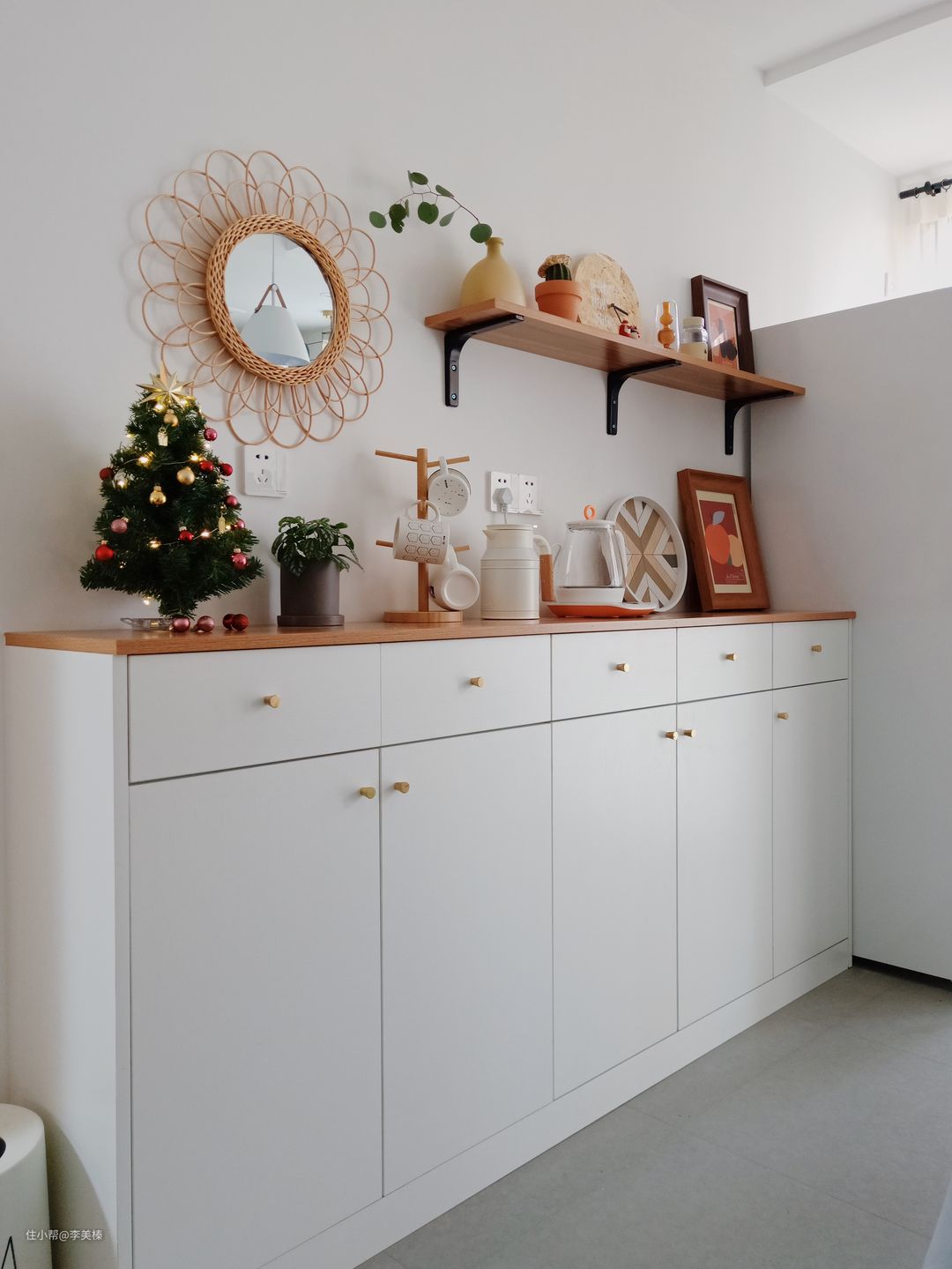 2、考虑到整体风格白色简洁,又跟橱柜呼应加了木色台面,网购的黄铜小拉手点缀。