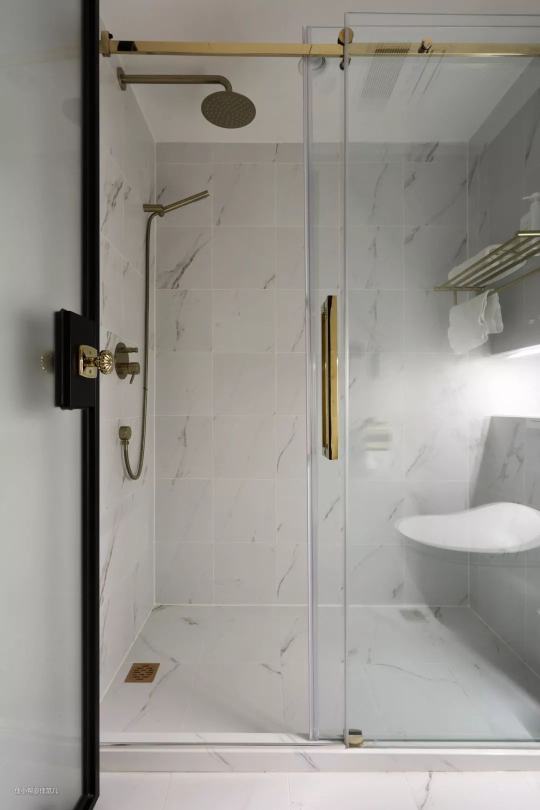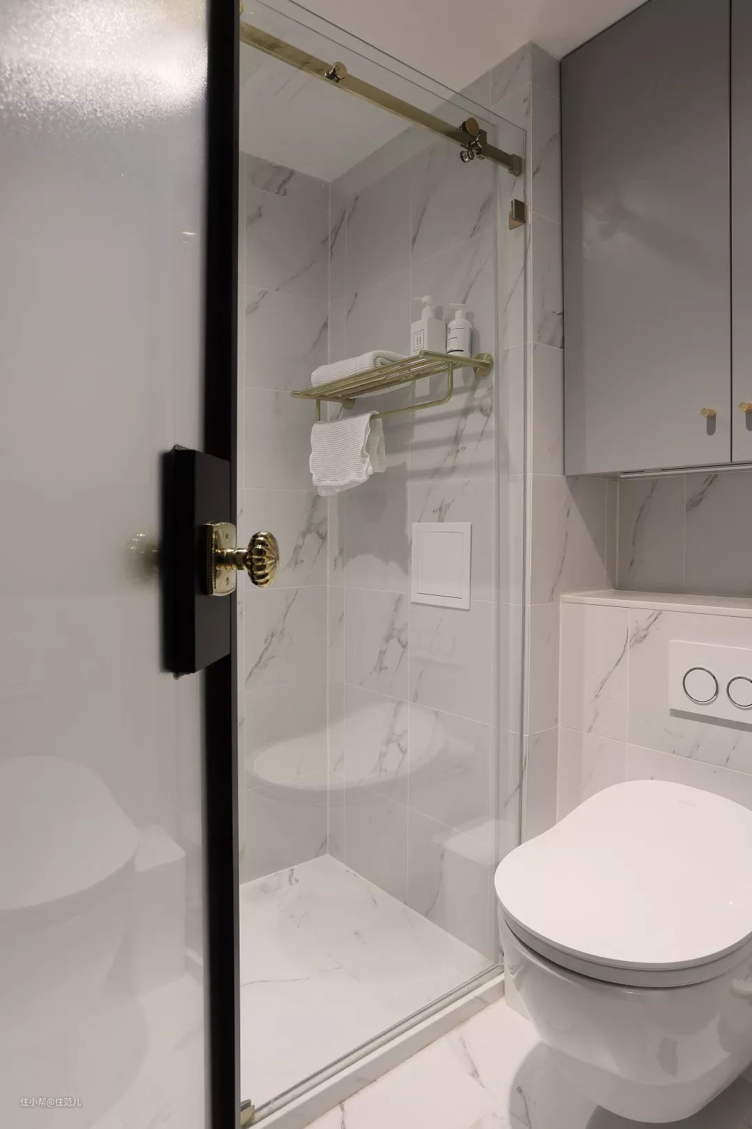 马桶和淋浴区的墙面地面,统一贴了300*300的大理石瓷砖。